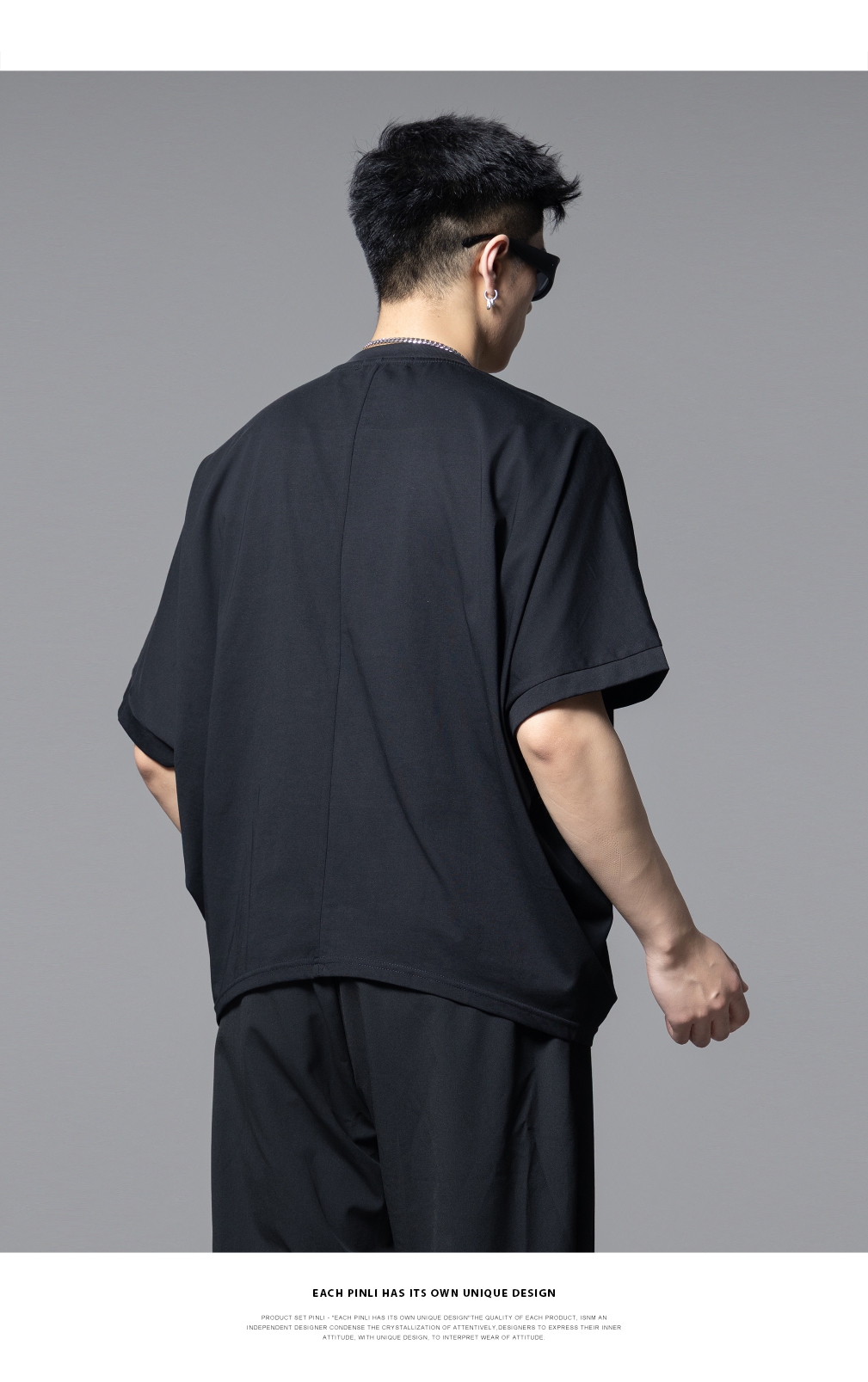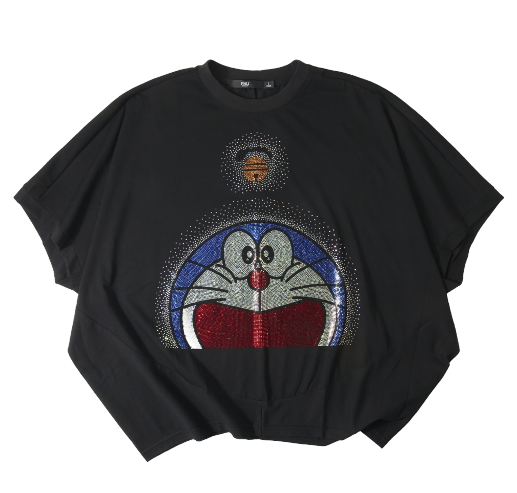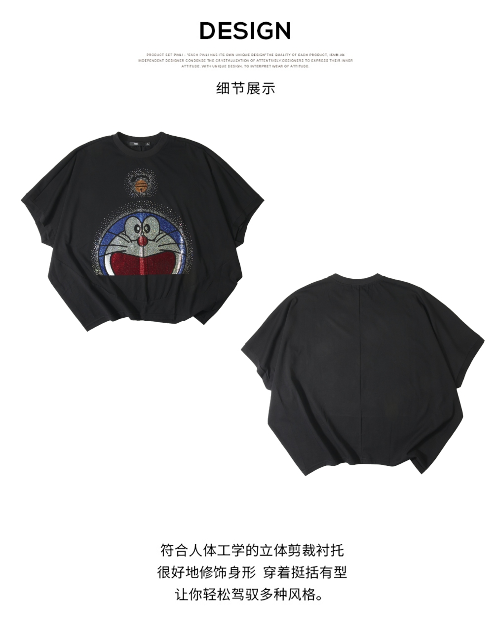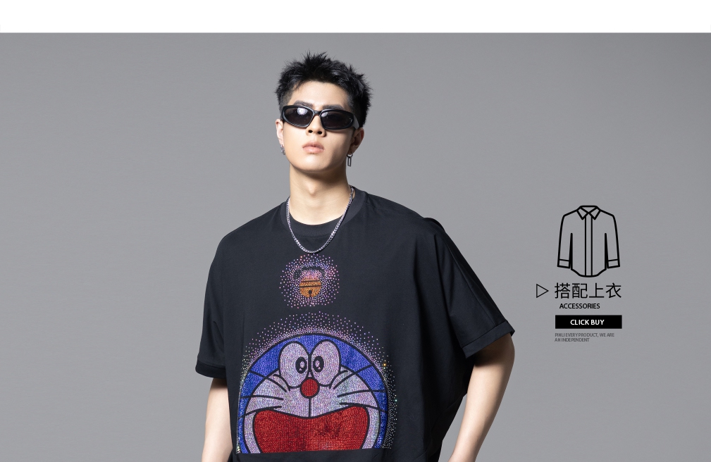PINLI品立2025夏季新款男士宽松廓形哆啦A梦烫钻圆领短袖T恤上衣BG252111055