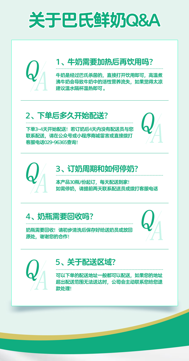 1、若订奶后4天内没有配送员与您联系配送,请在微信留言或直接拨打96365查询,谢谢您的合作!