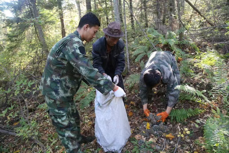 松子是野猪、黑熊、松鼠等动物的食物来源之一,为了避免过度采集和野蛮采集引起动物食物短缺及松林退化,合作社成员仅以人工攀爬方式进行采摘,避免对松树造成损伤;同时,采摘红松塔时要保留产量的10%至25%,保证野生动物顺利越冬。