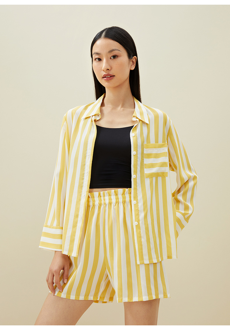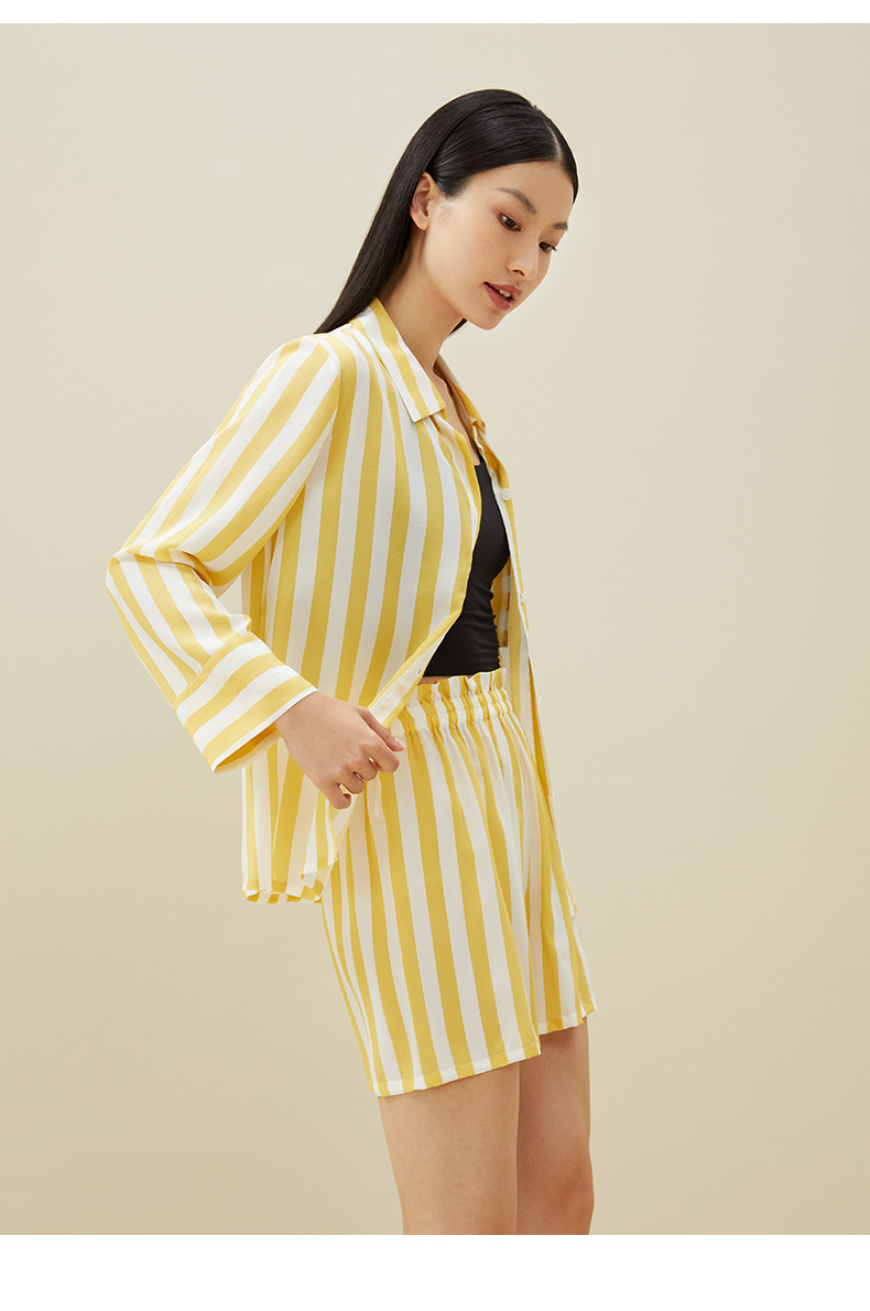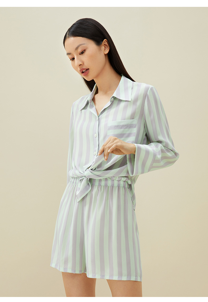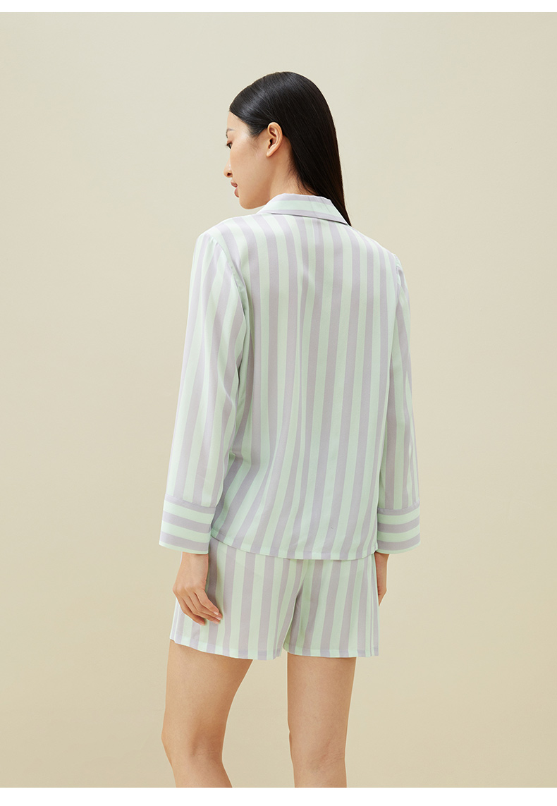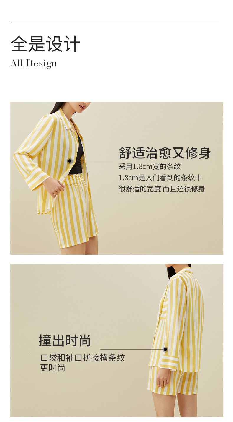 【不易皱真丝】100%桑蚕丝时尚竖条纹可外穿家居服真丝睡衣套装女金三塔 YSFDB201
