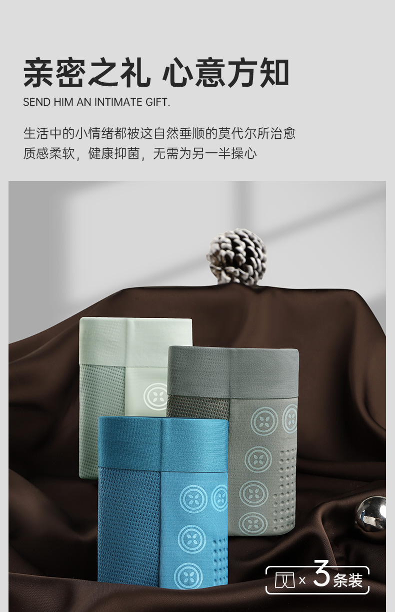 N1-【3条装】【100支兰精莫代尔 桑蚕丝底档 3条装】润微网孔男士内裤兰精莫代尔男式四平角透气裤衩 小空调