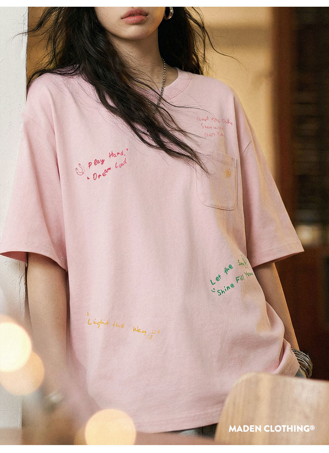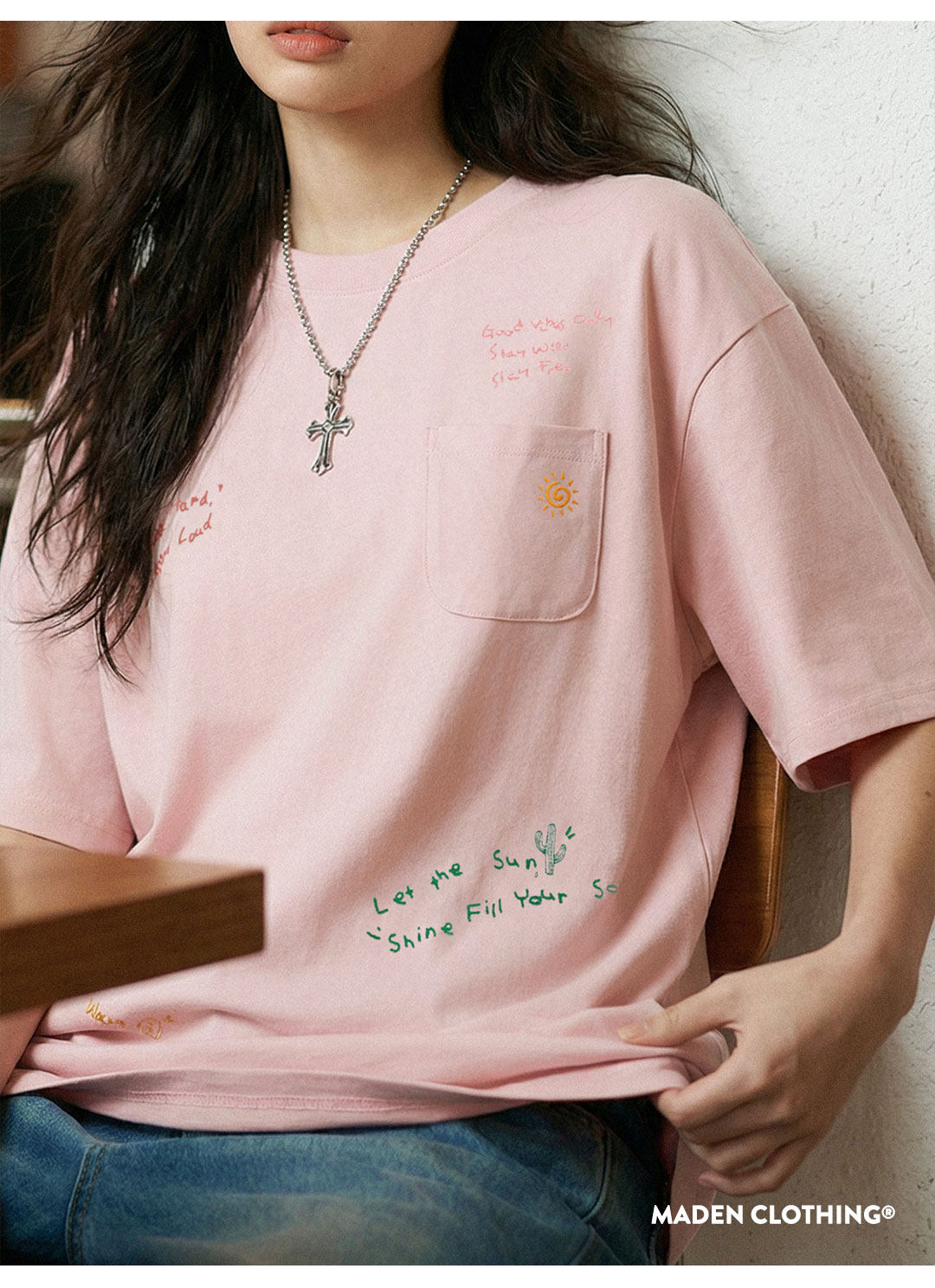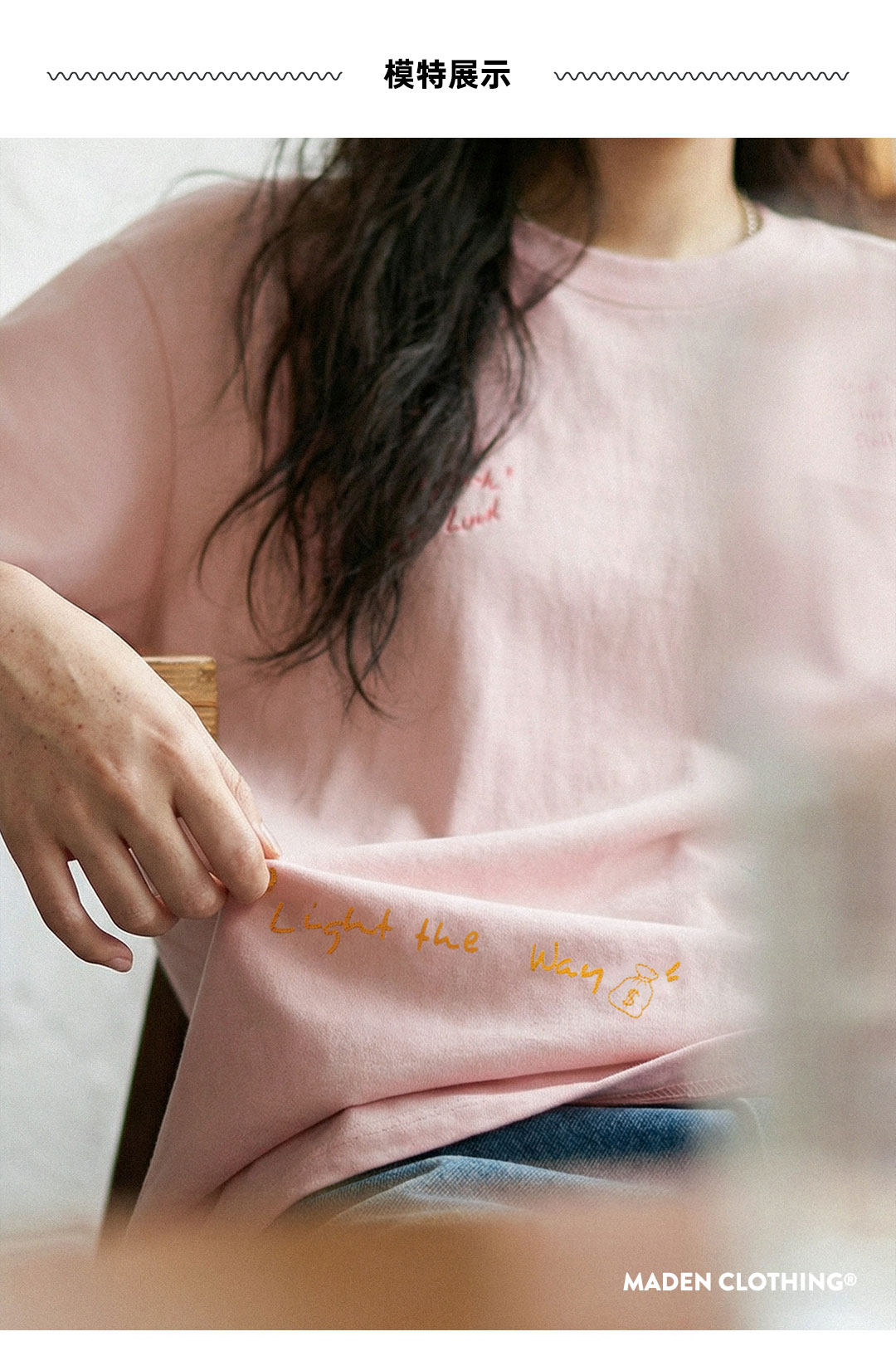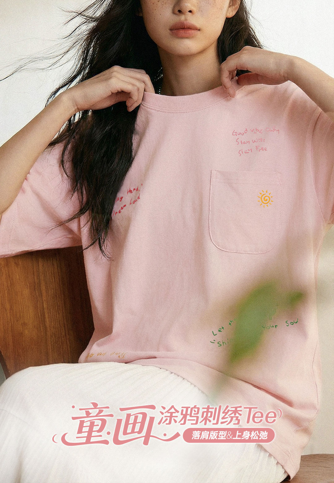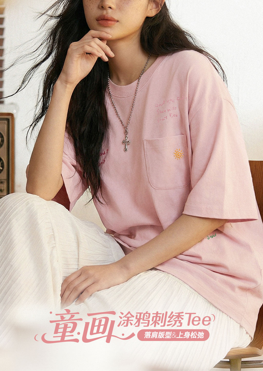 马登美式粉红色圆领落肩口袋宽松刺绣短袖t恤五分半袖上衣女士夏