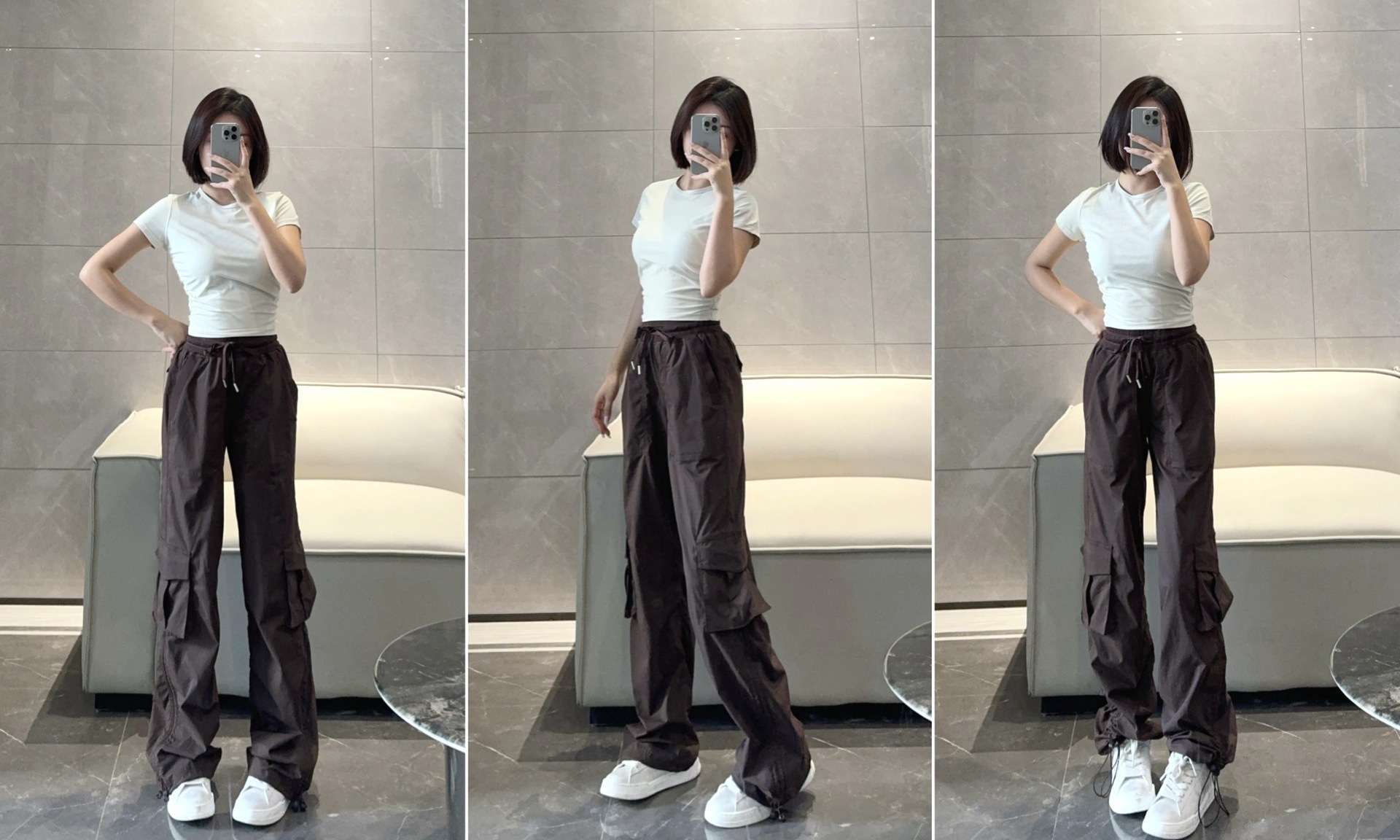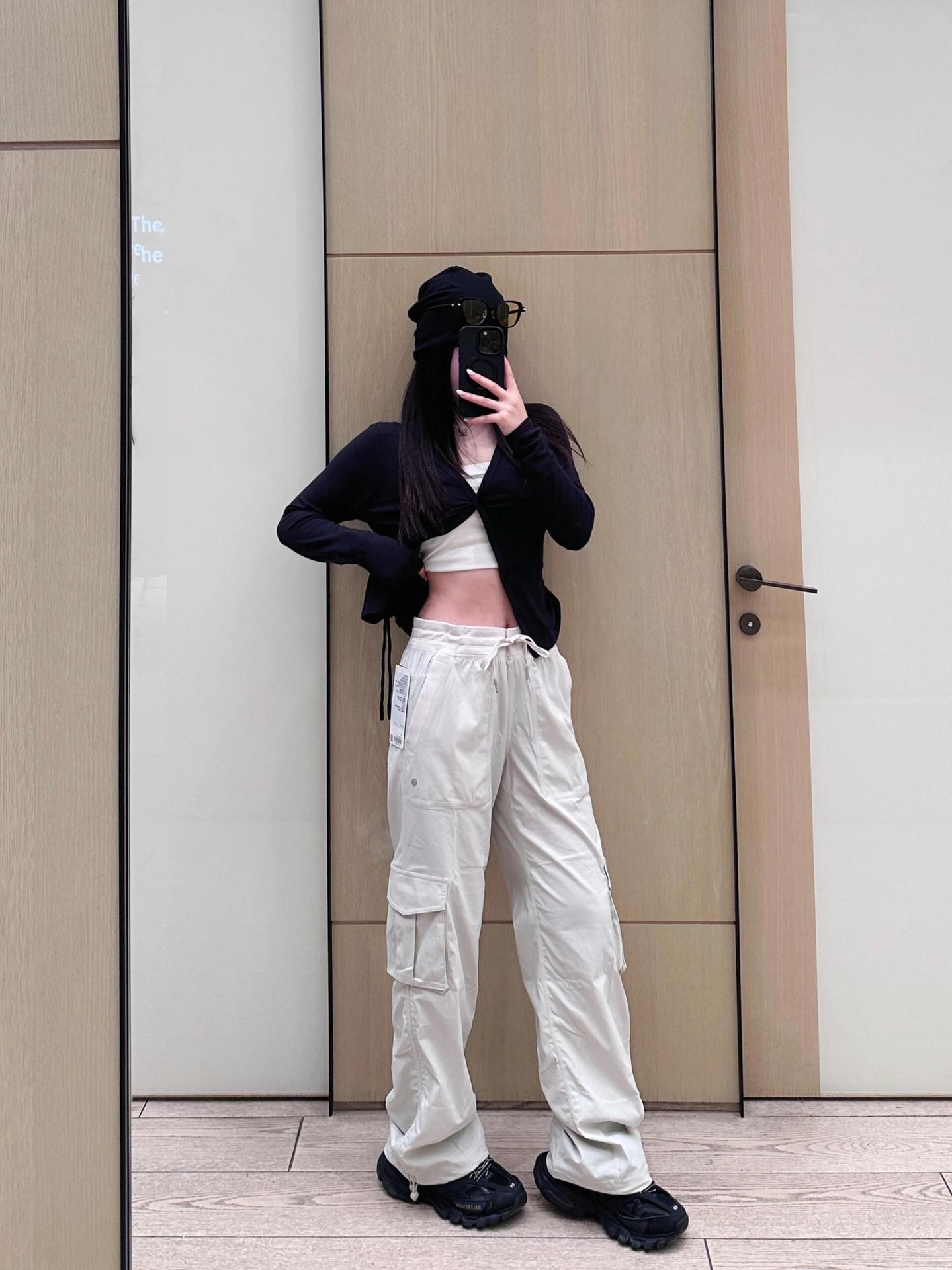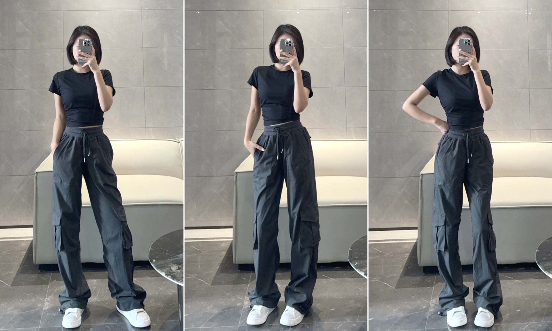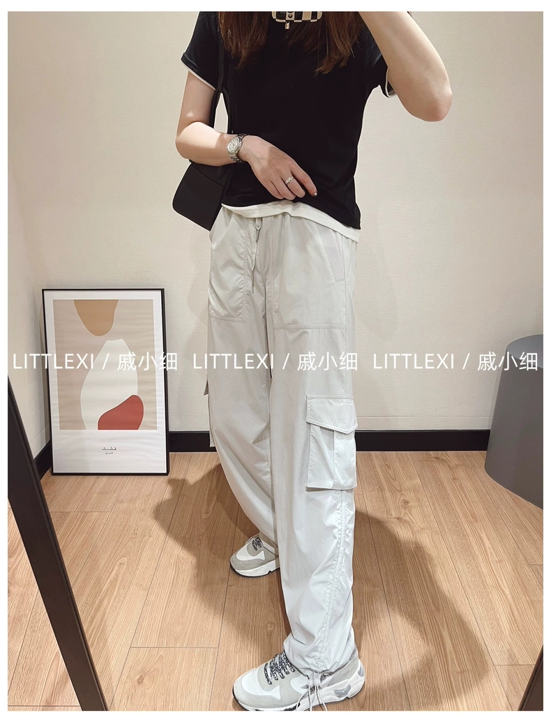 穿上后自带提臀效果,腰围和口袋做了拼接设计,特潇洒,小腿处的抽绳设计,有两种调节方式,上下抽紧可以调节裤子长度,左右收紧裤腿就变成束脚裤型。