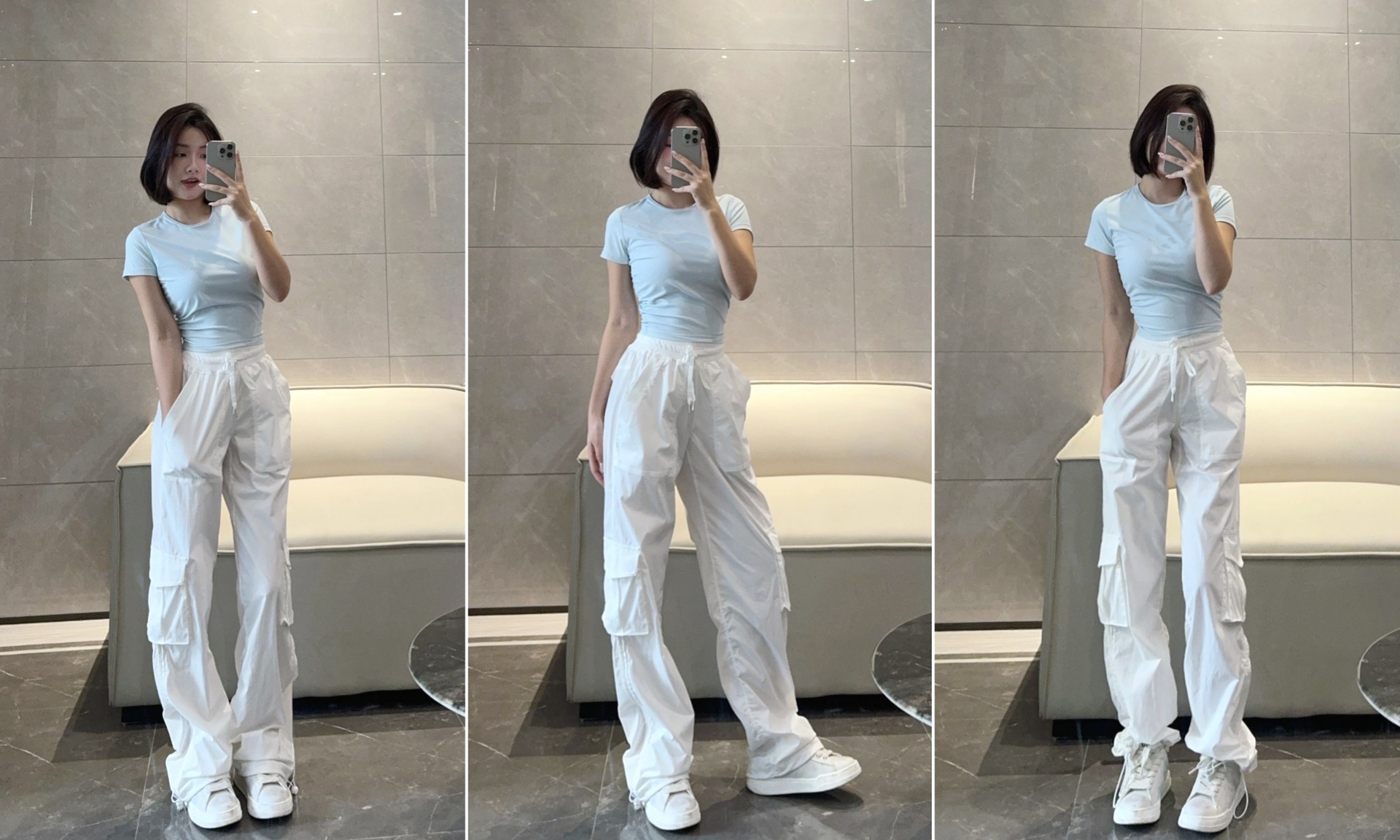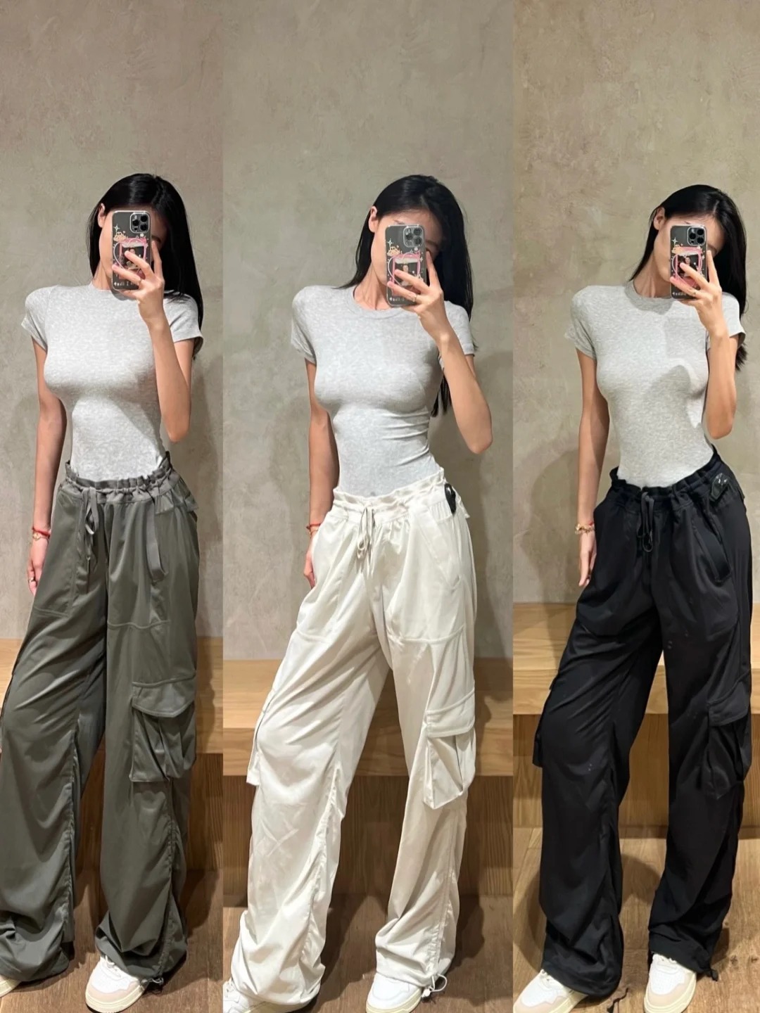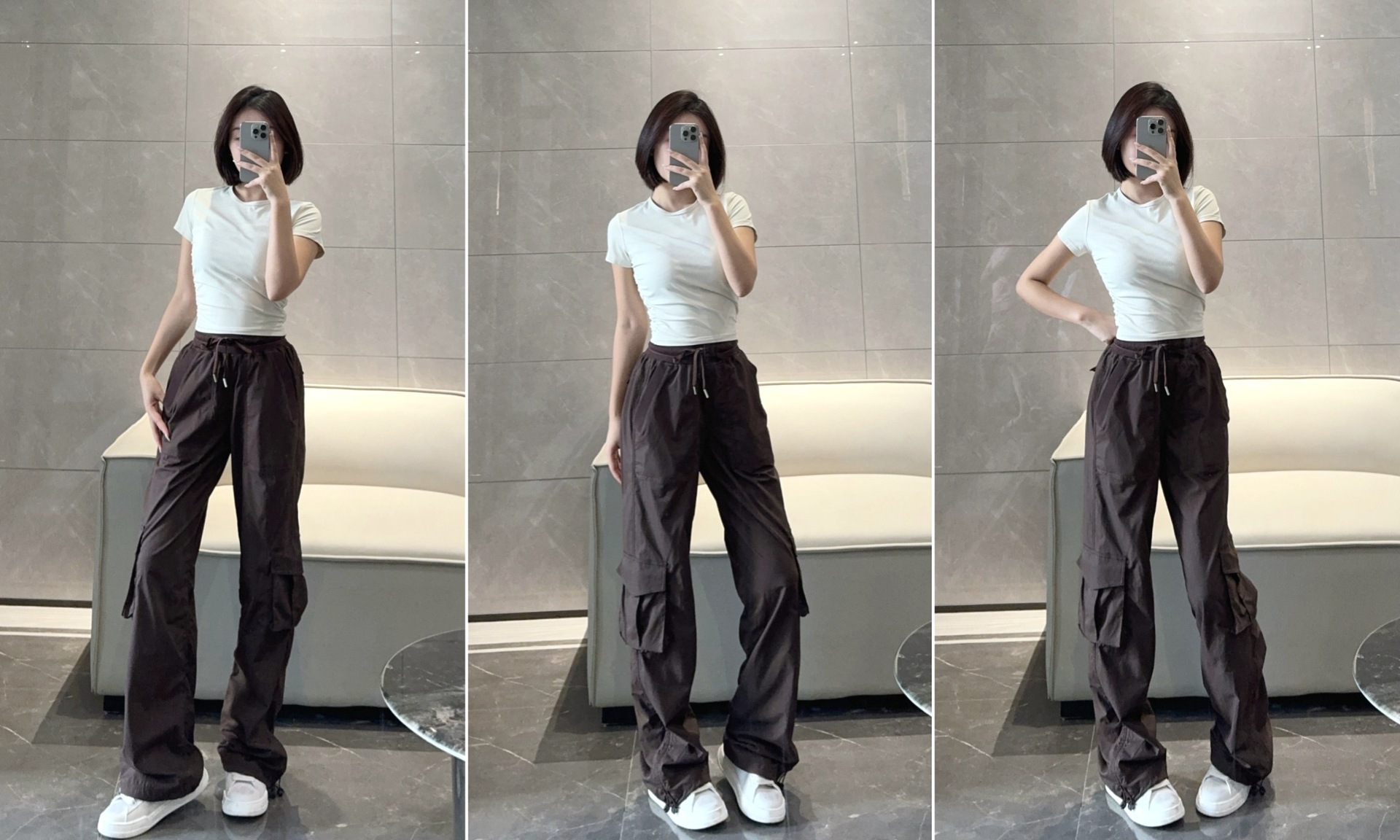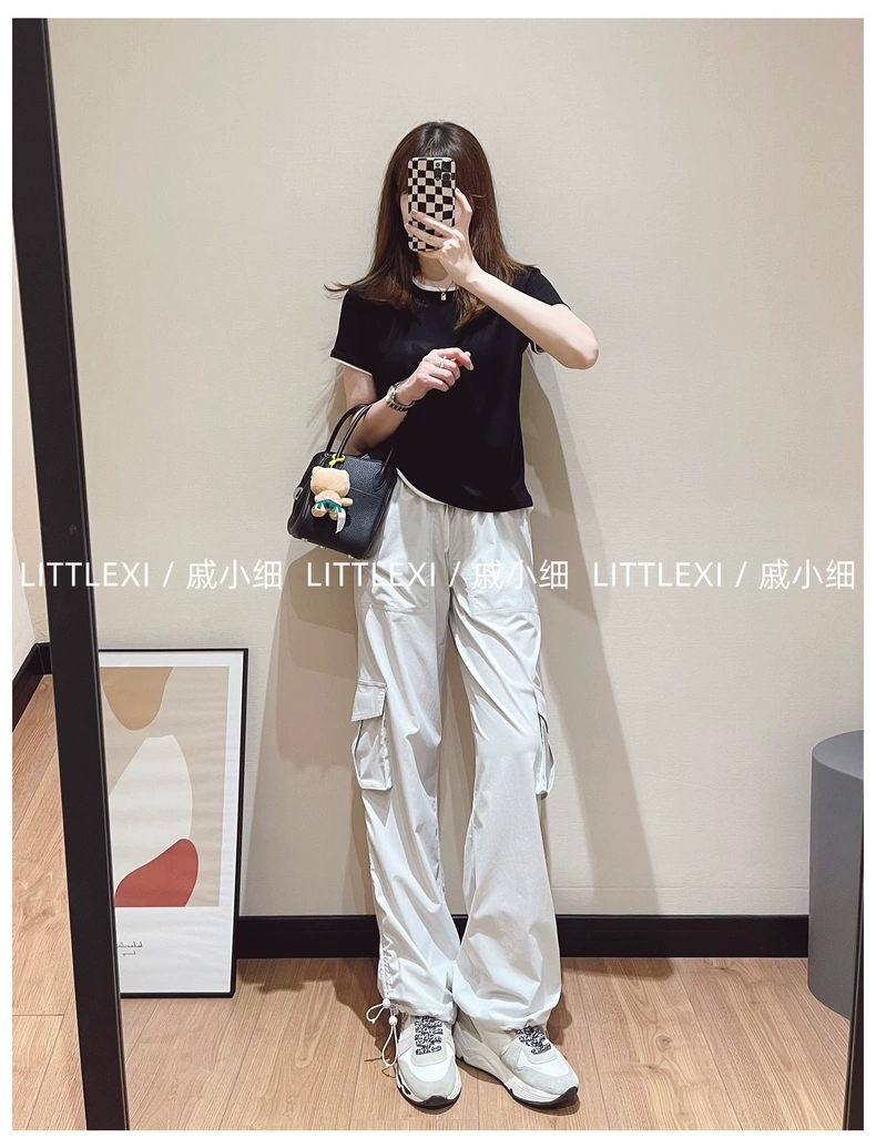 穿上后自带提臀效果,腰围和口袋做了拼接设计,特潇洒,小腿处的抽绳设计,有两种调节方式,上下抽紧可以调节裤子长度,左右收紧裤腿就变成束脚裤型。