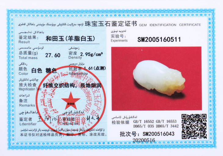 赠羊脂玉证书(证书编号SM2005160510)