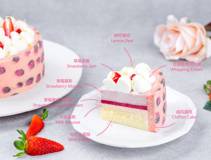 特选食材:铁塔淡忌廉(法国)、铁塔芝士(法国)、马斯卡波尼奶酪(法国)、宝茸草莓果茸(法国)、宝茸覆盆子果泥(法国)、新鲜草莓(中国)、安佳牛油(新西兰)、百年伊势鸡蛋(日本)、幼砂糖(韩国)