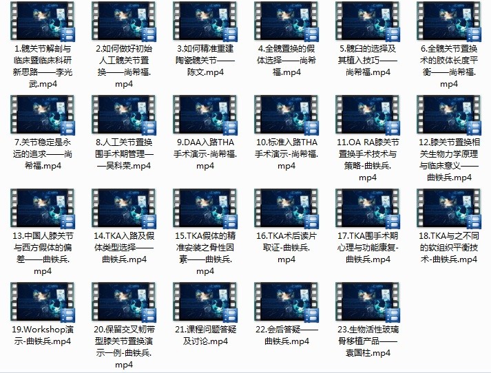 本U盘视频完全源自授课内容,共有22个相关视频可供关节外科医生和研究生学习。清晰的学术大餐,将给您身临其境的绝佳感受。