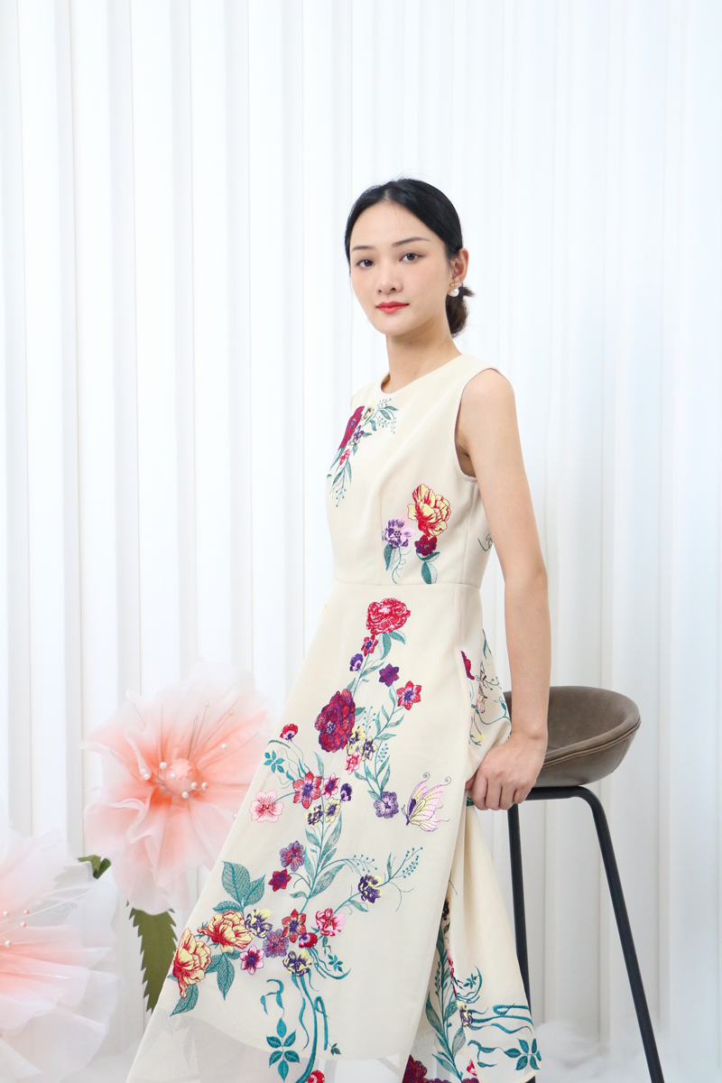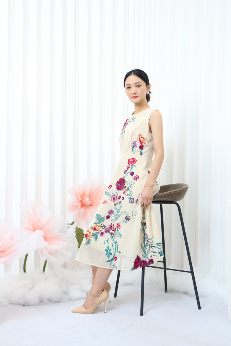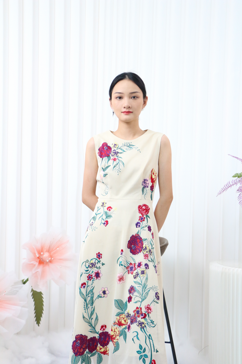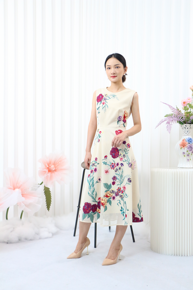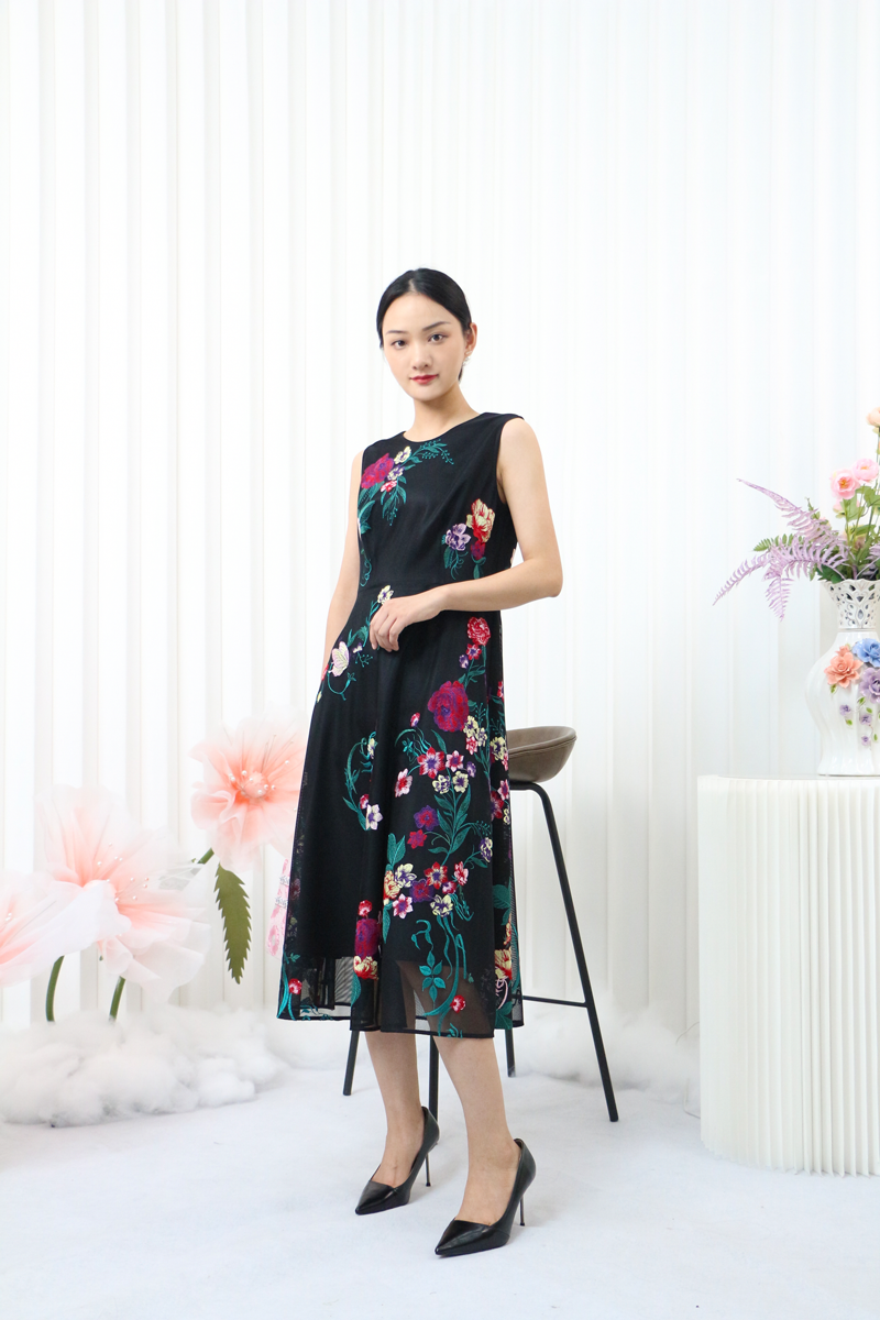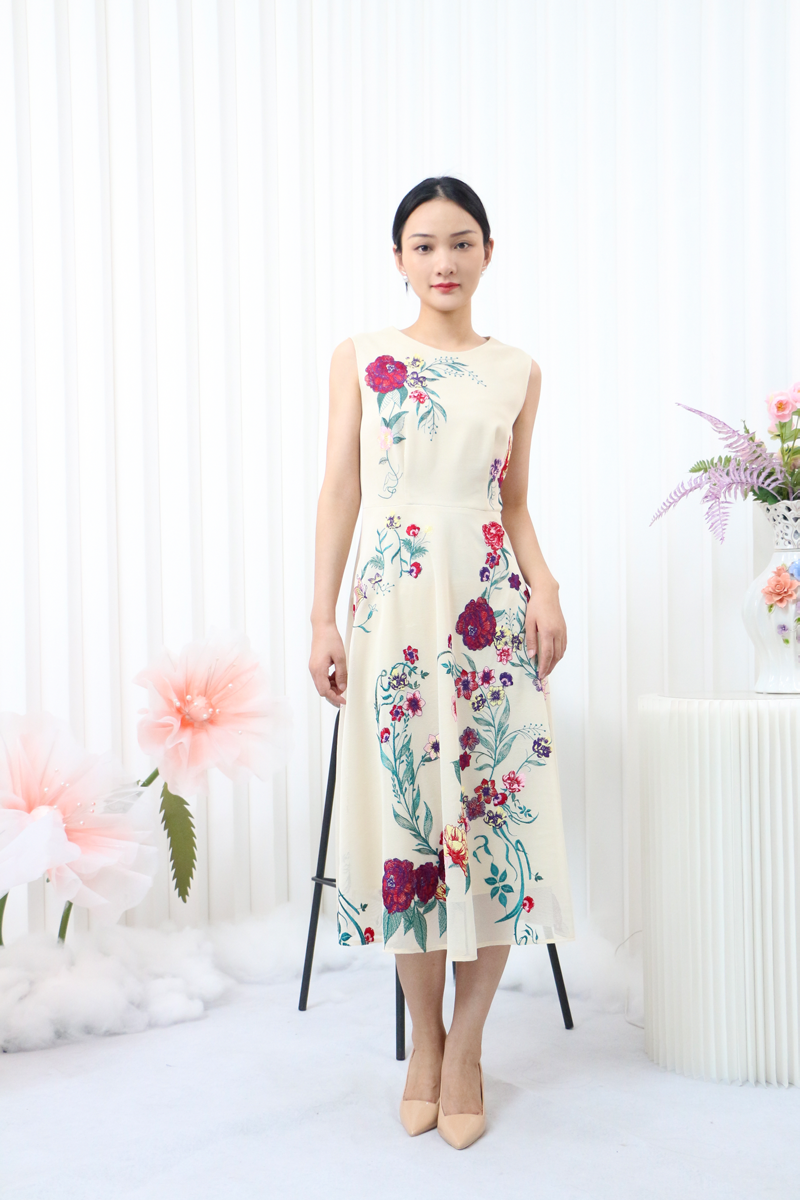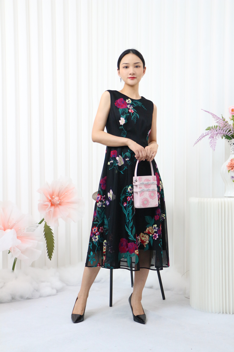 大花图案的背心裙搭配净色的外套,