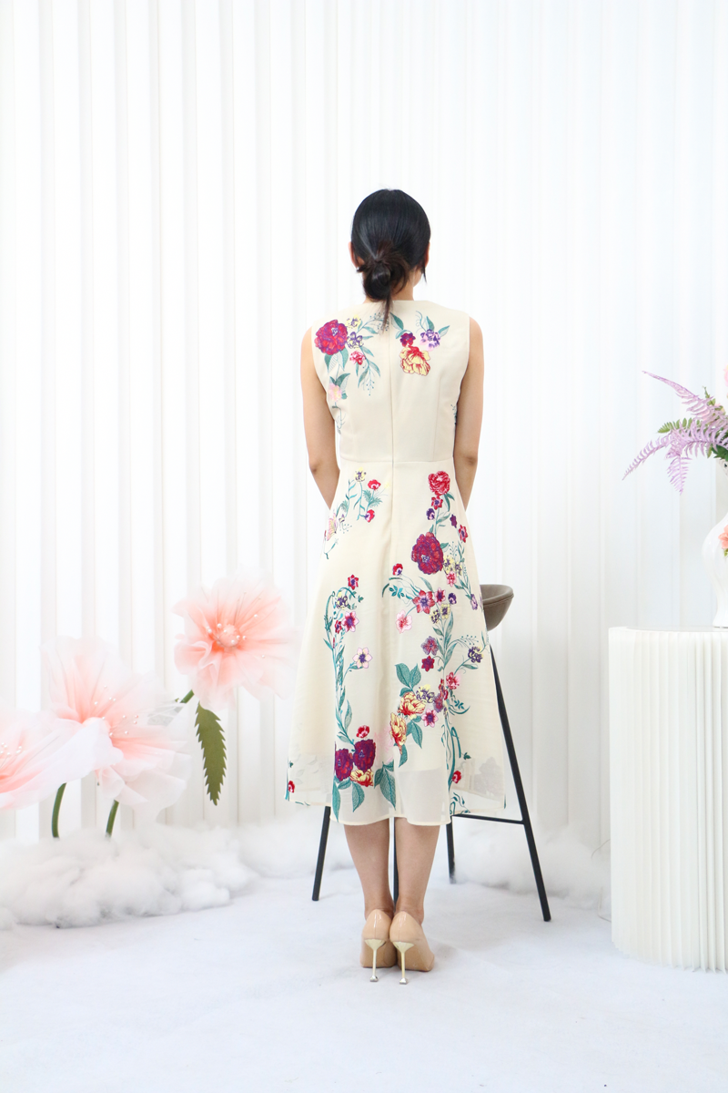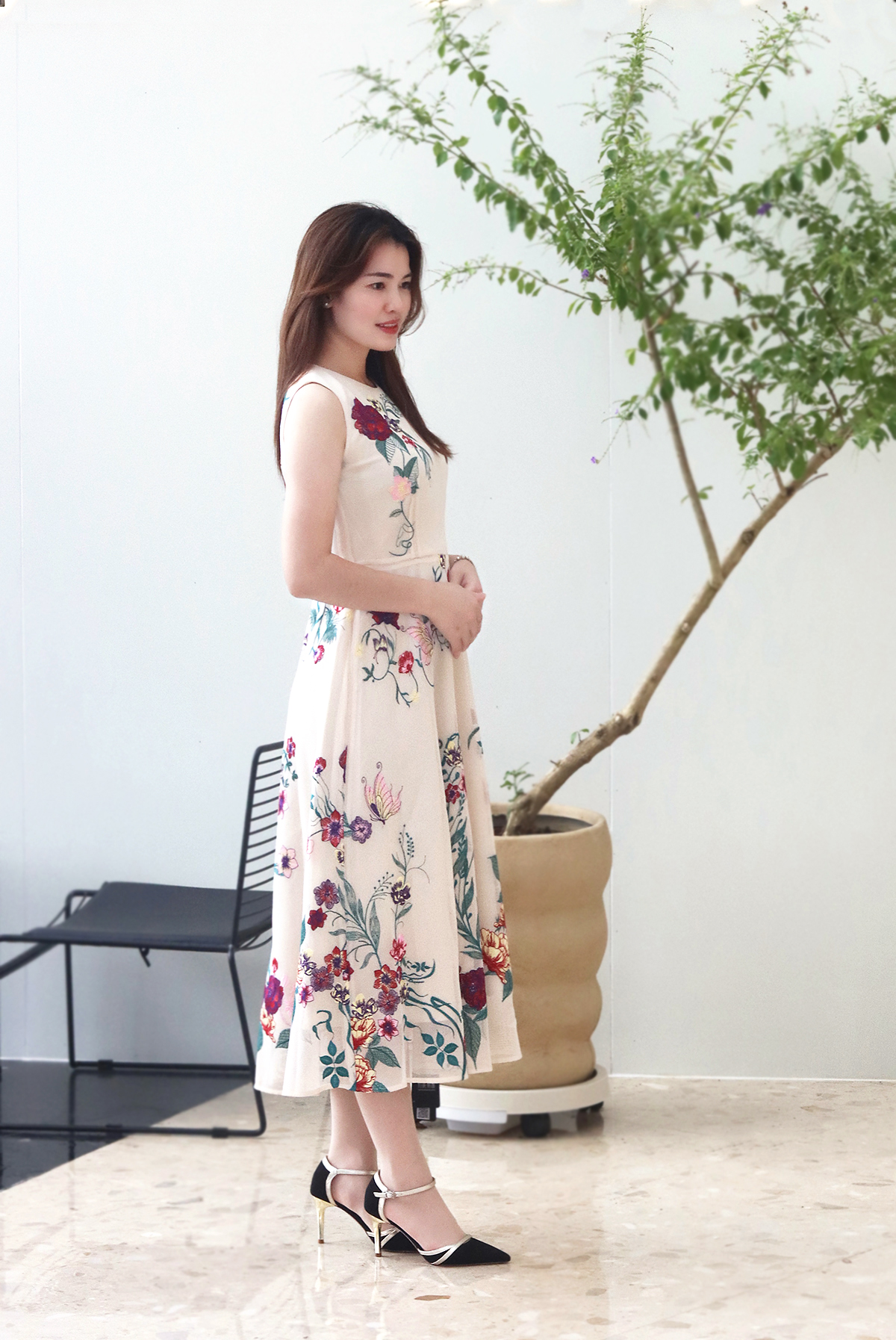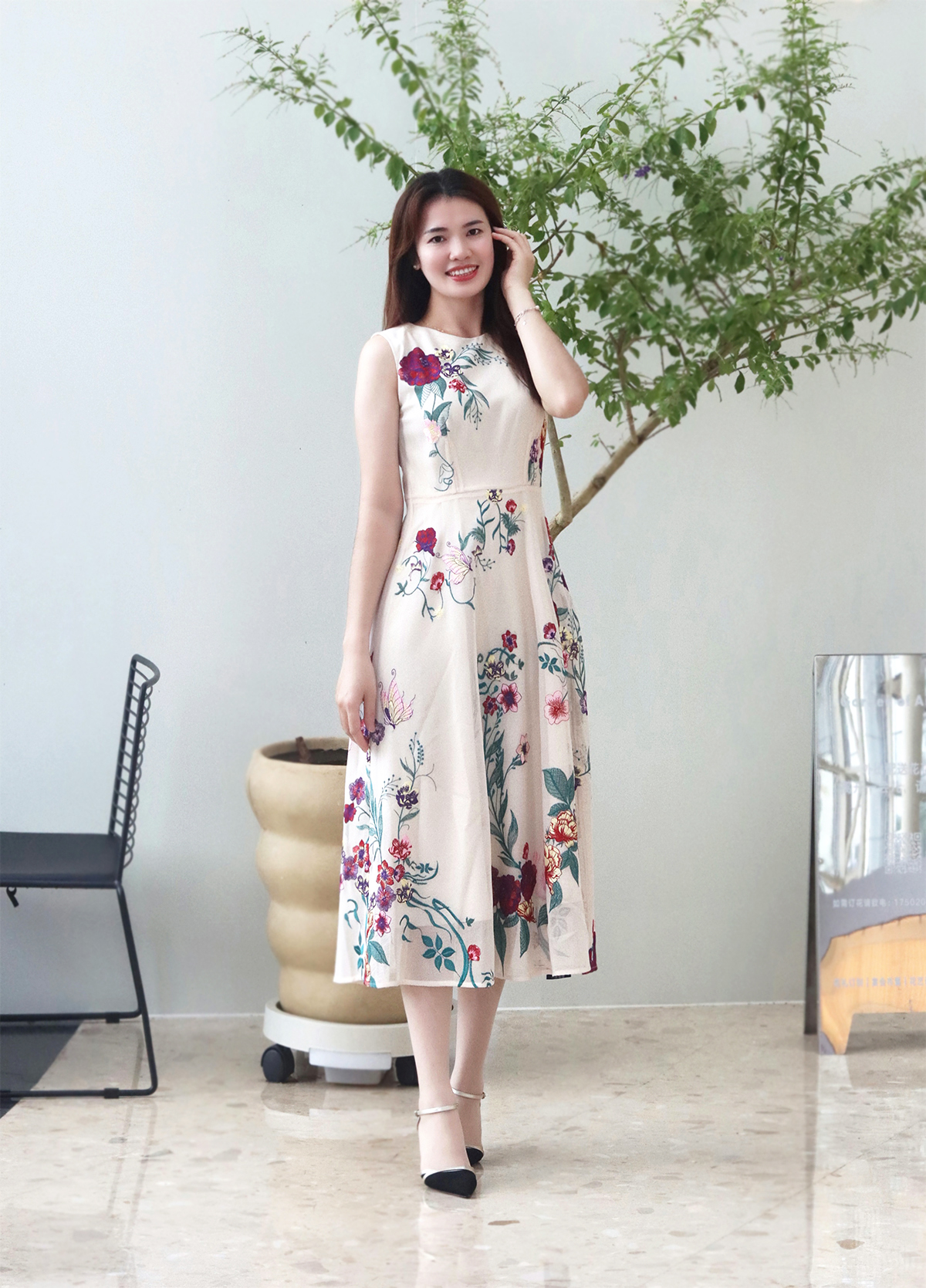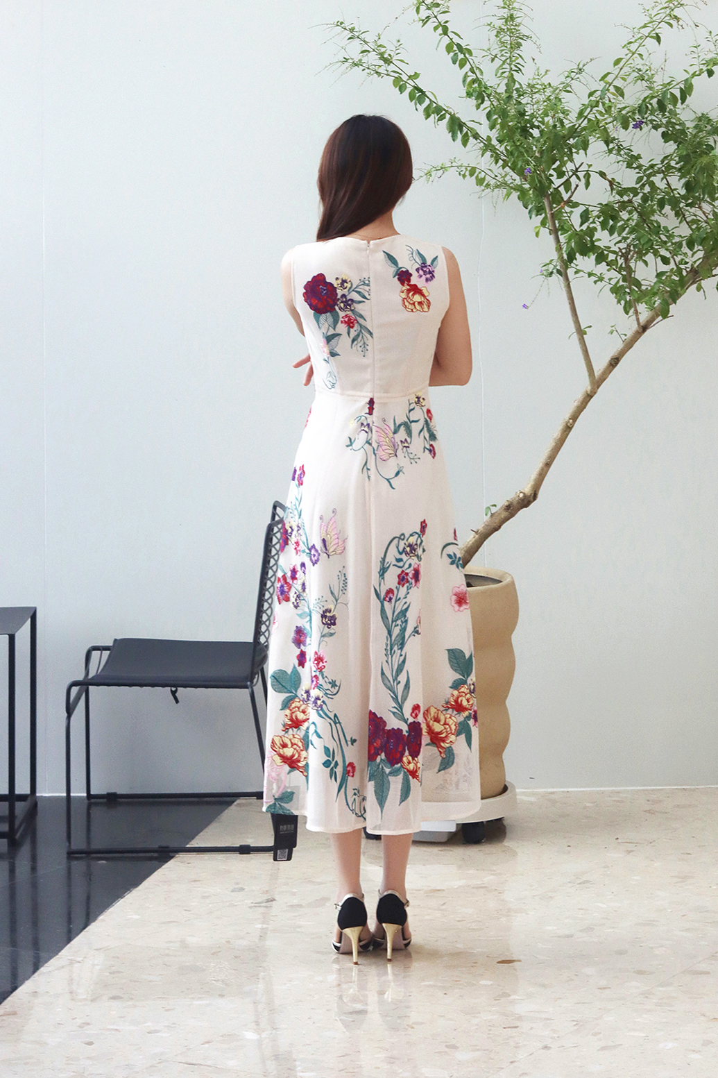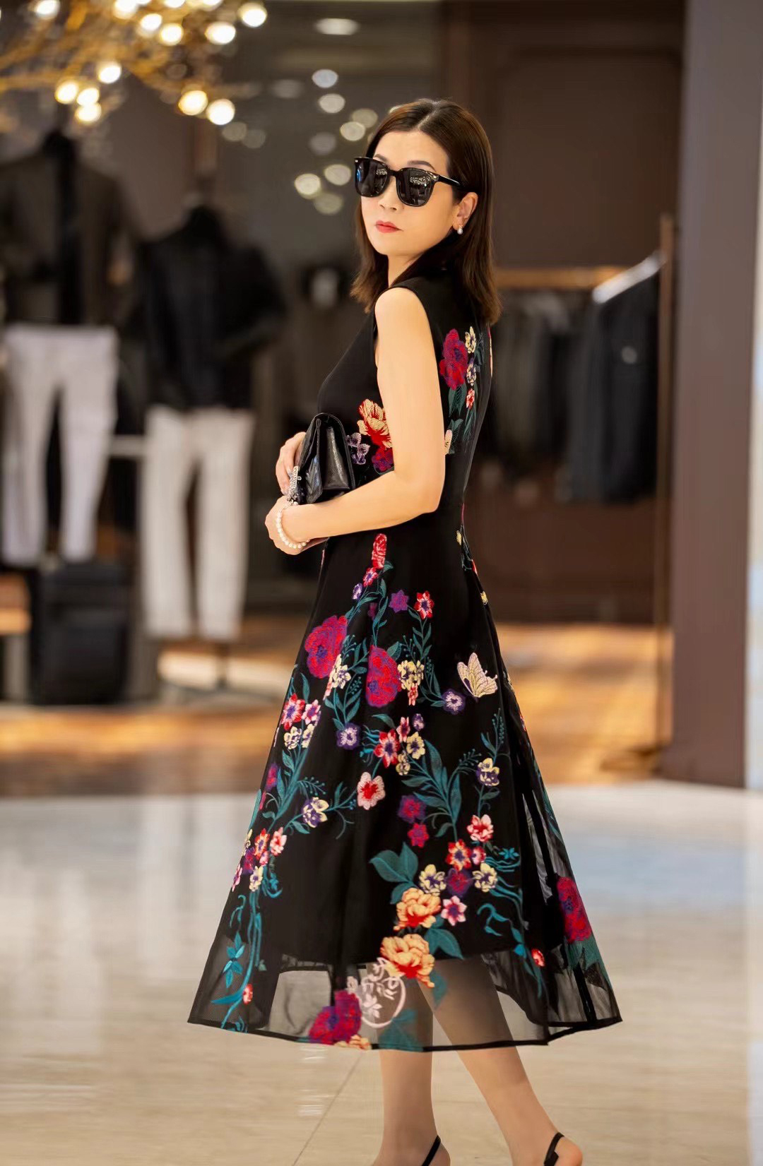 大花图案的背心裙搭配净色的外套,