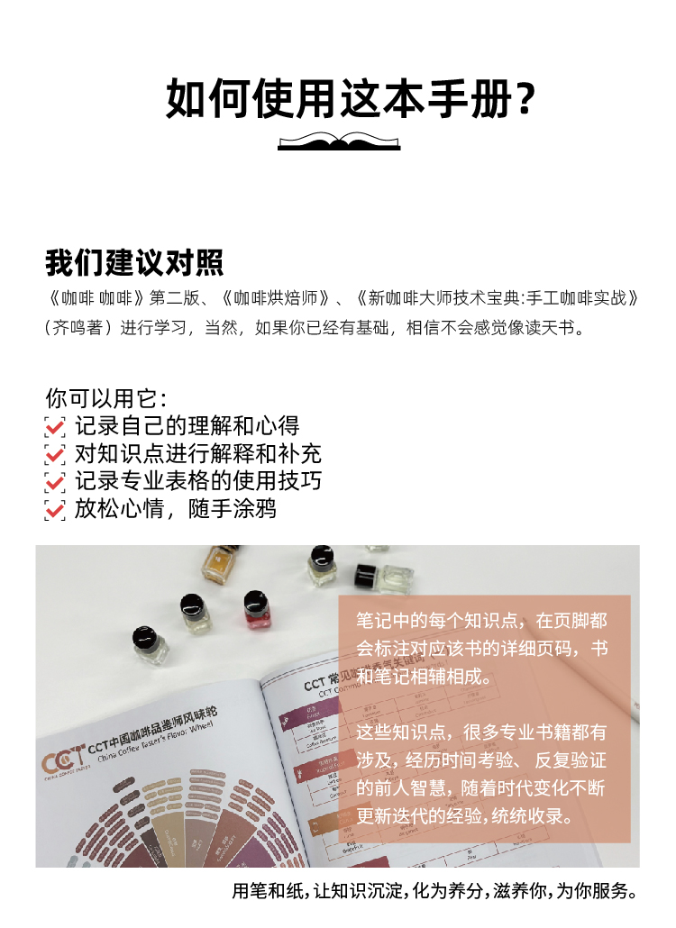 《咖匠笔记》中虽然有大量的文字、数据、图表和知识点,但更多的是一套覆盖完整精品咖啡产业链的空白表格和留白篇幅。严格来说,这是一本用来学习和记录的笔记本,而不是一本书。如果您只是需要一本咖啡图书,请慎重购买。