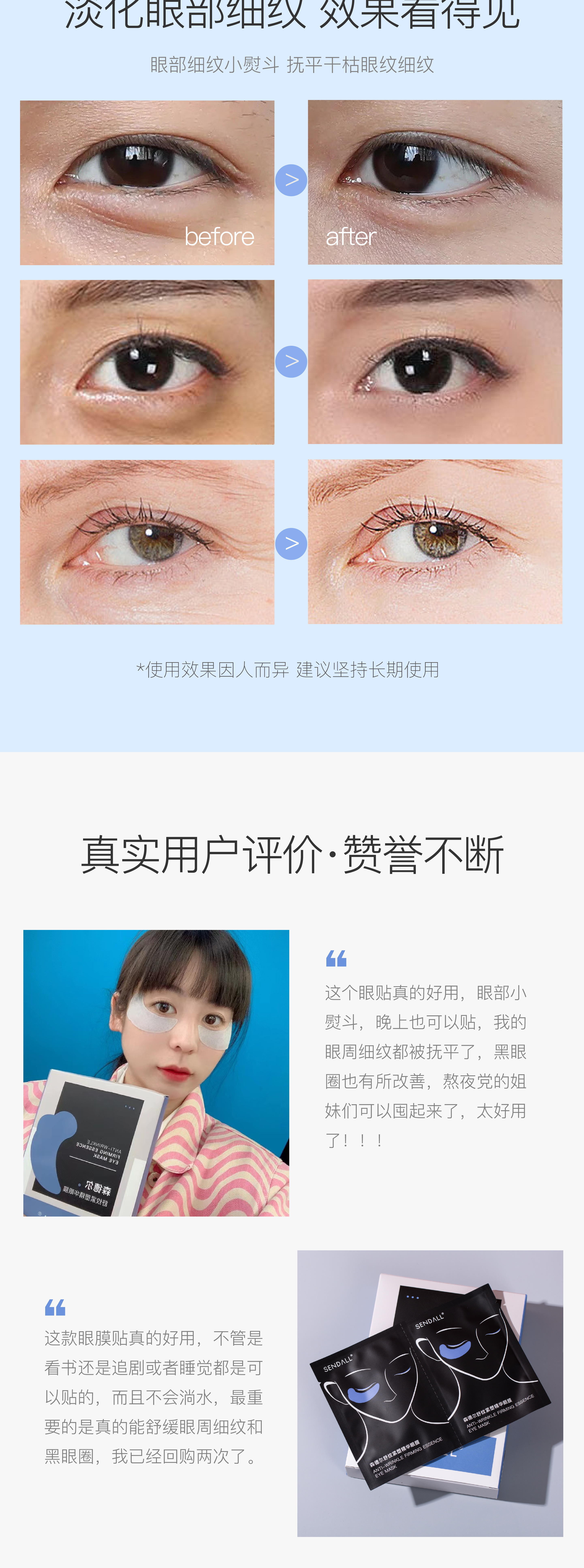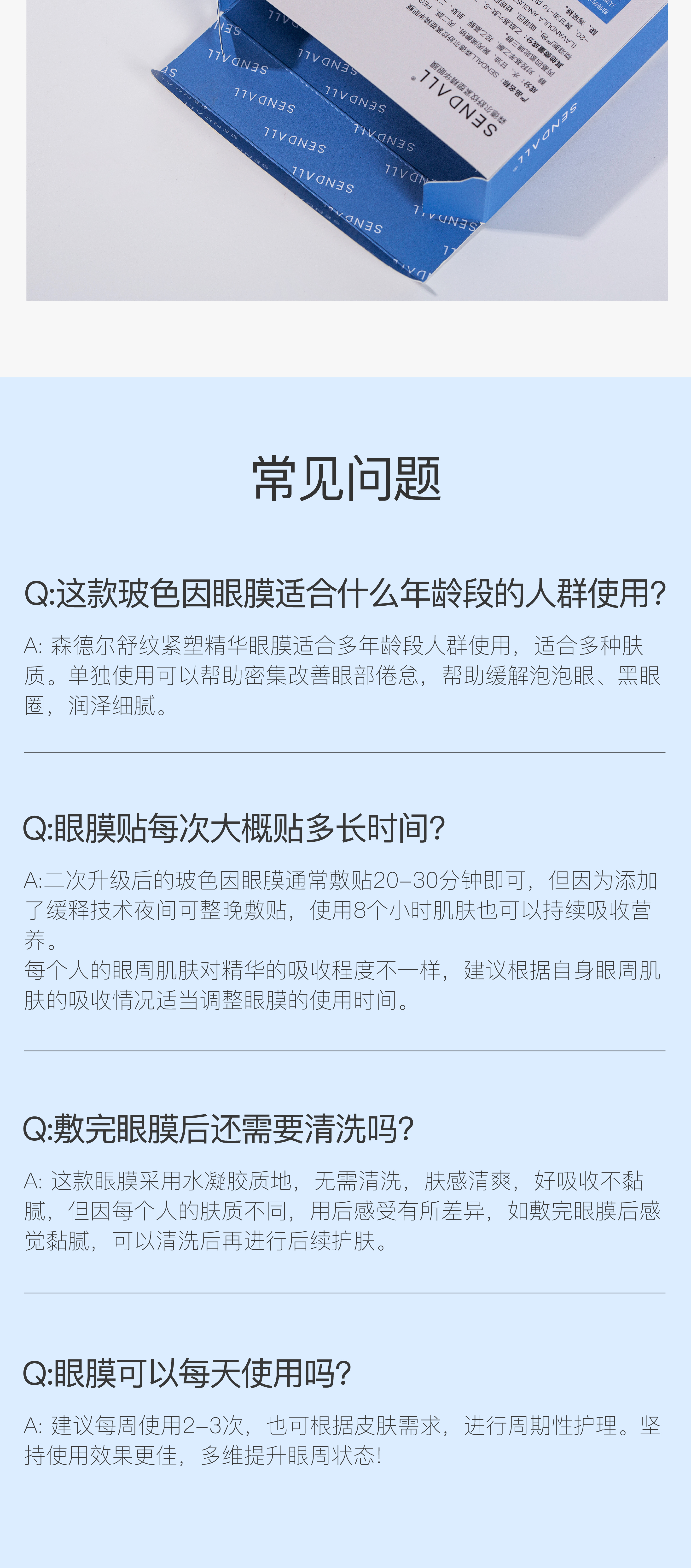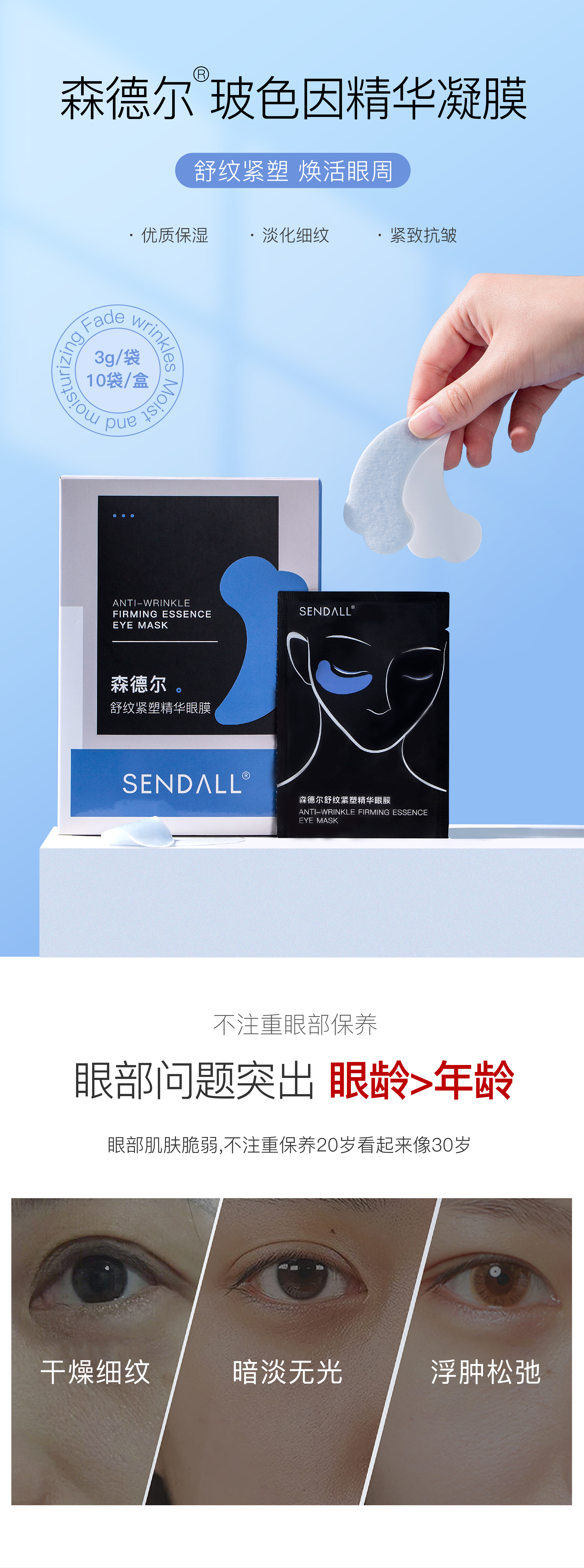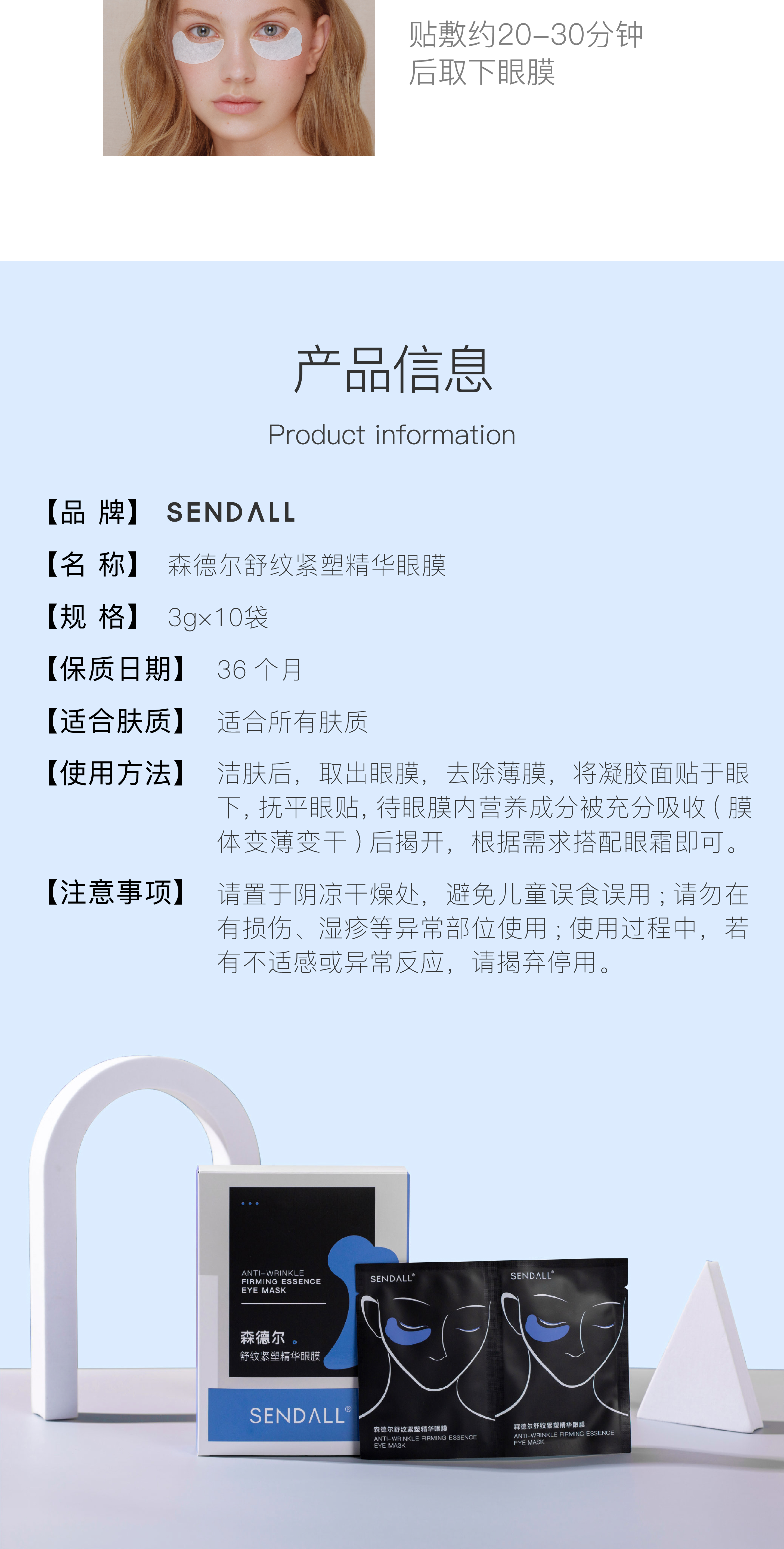 | 【品名】SENDALL森德尔 舒纹紧塑精华眼膜 【规格】1对/袋,10袋/盒 【保质期】3年 【发货包装】独立包装盒 【最佳使用期限】2026年3月 【发货地】河南 【发货快递】申通 【不发货区域】新疆,西藏,青海,港澳台 【加运费区域】海南省三沙市+10元/单 【发货时效】48-72小时,周末节假日顺延 |