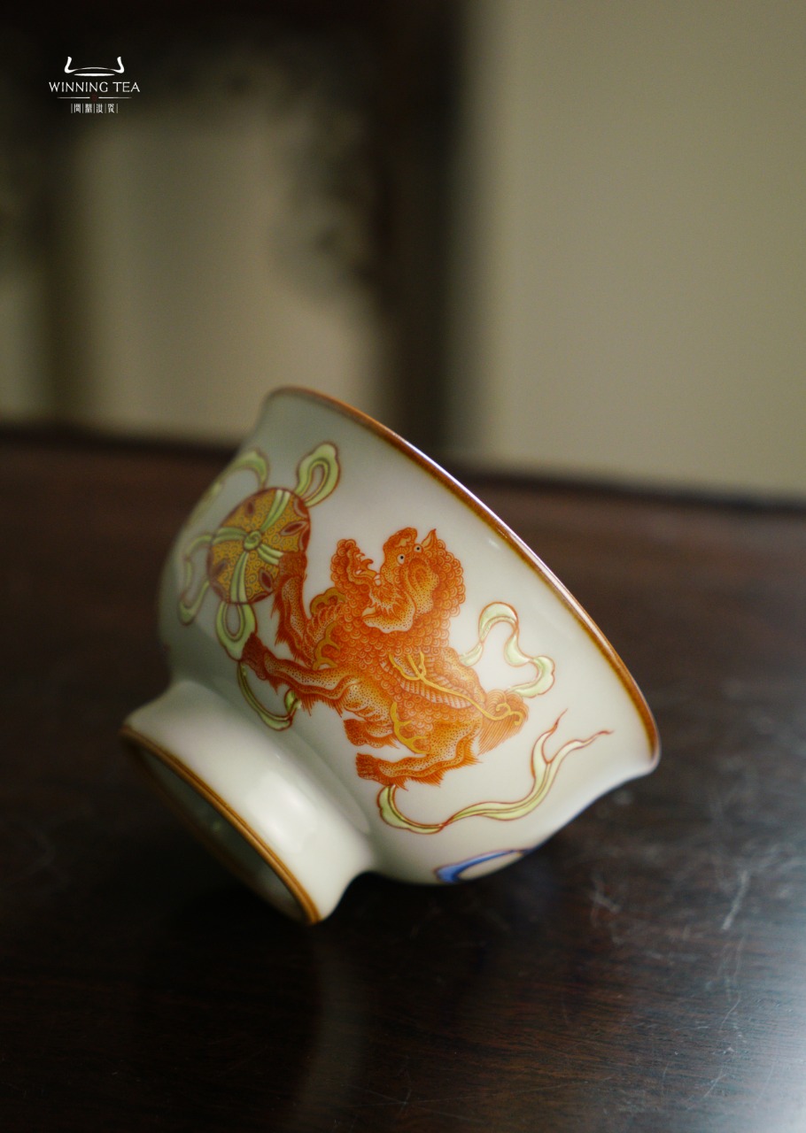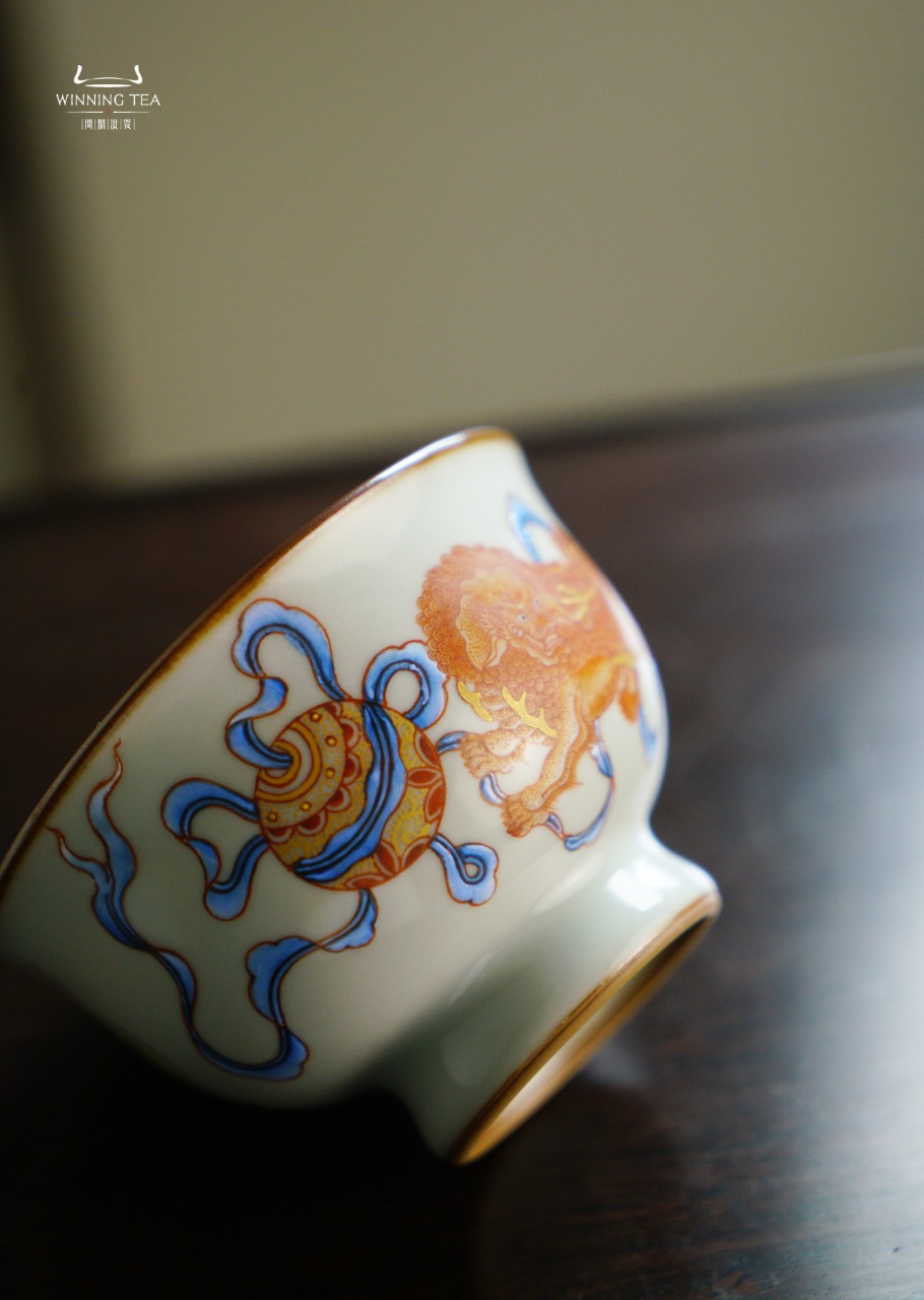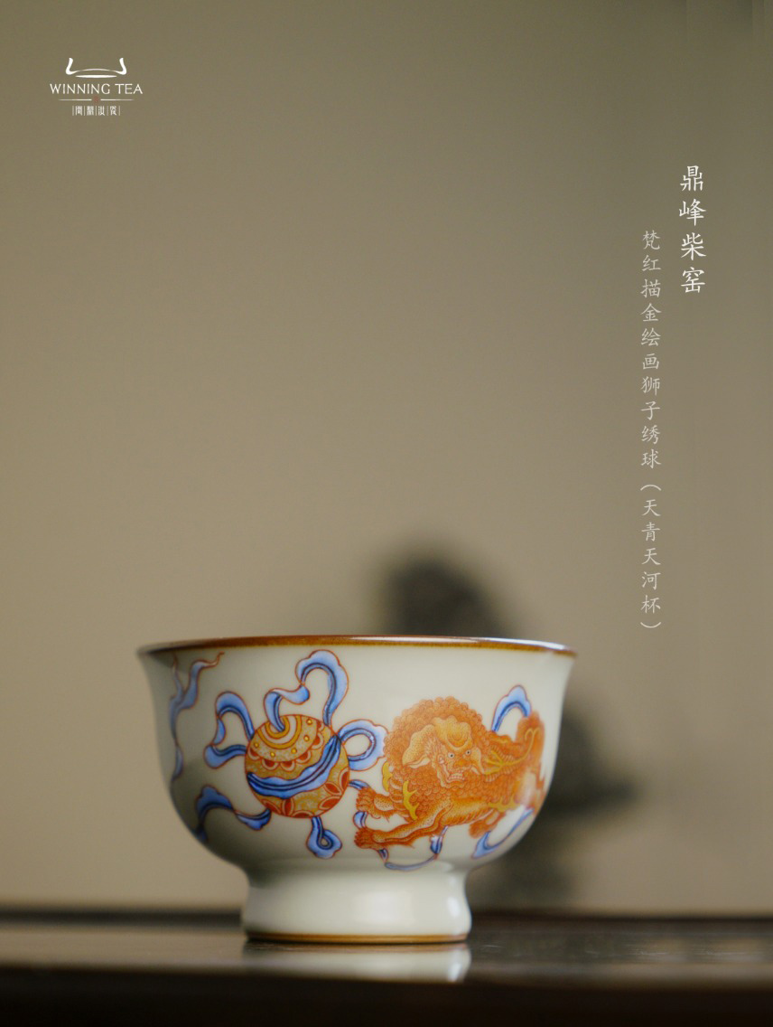 问鼎汝瓷鼎峰柴窑天青天河杯(梵红描金绘画狮子绣球)( 缺货 )