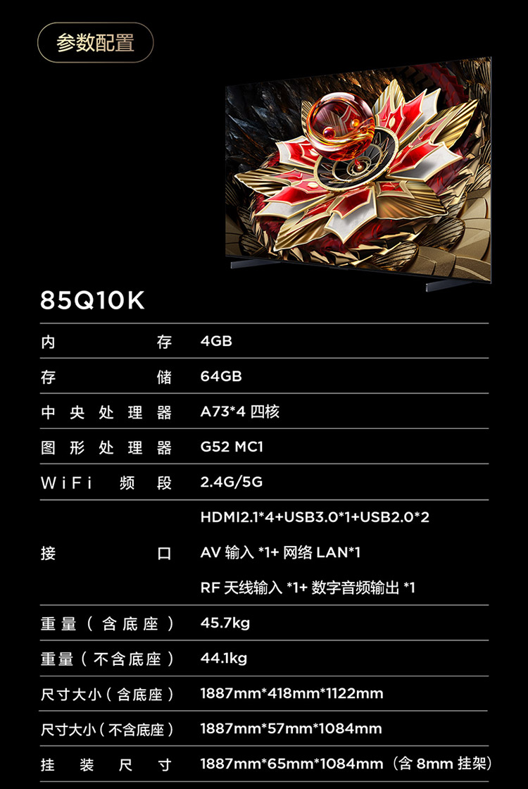 TCL电视 85Q10K 85英寸 QD-Mini LED 2304分区 XDR 3800nits QLED量子点 超薄电视