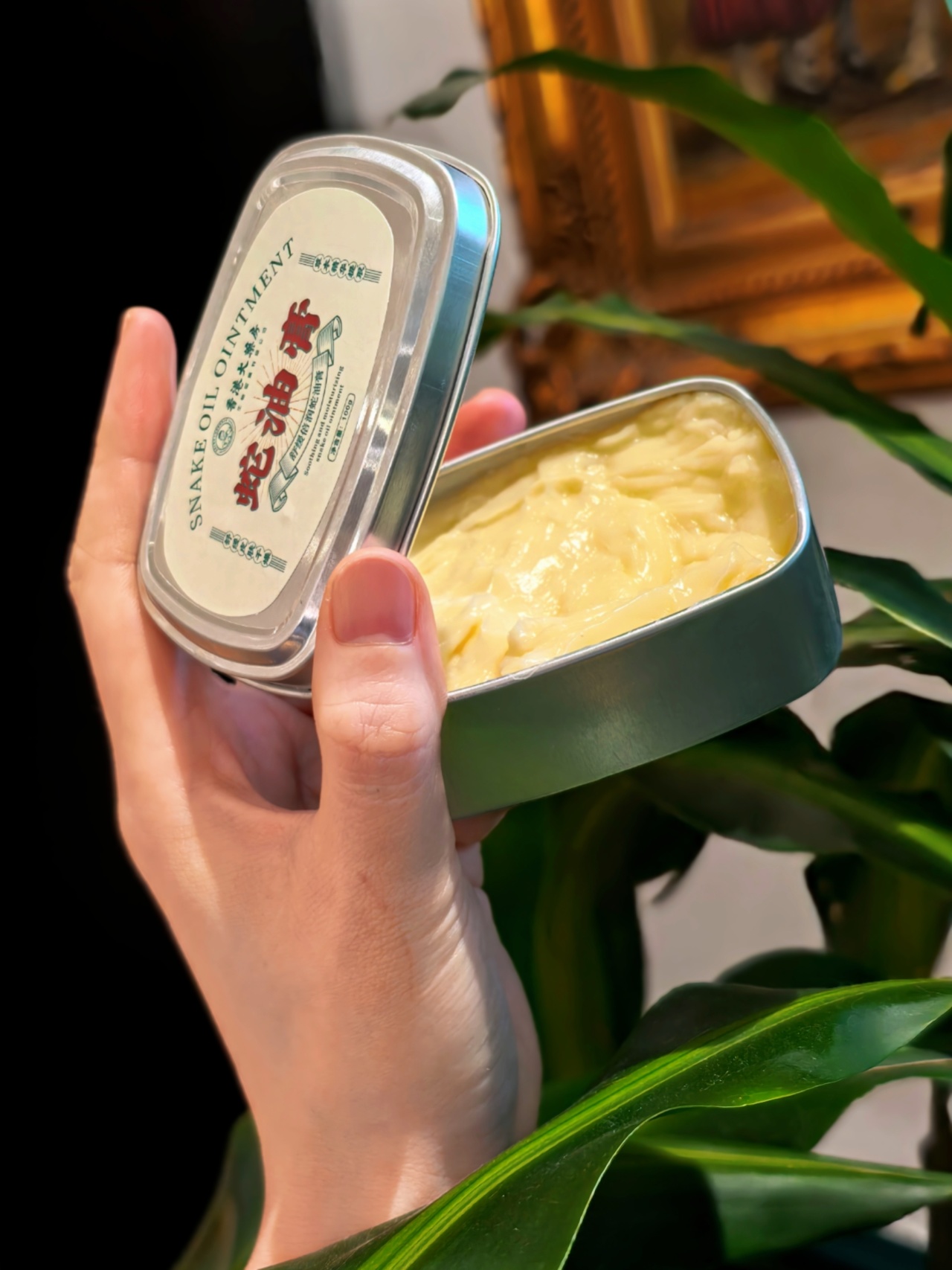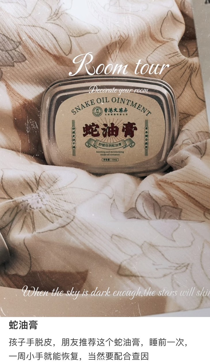 蛇油膏的盒子看起来小,但其实也有100g,扁扁的,放包里可以随时补涂。使用感也很出众,和很多厚重难吸收的膏体不同,它的质地像绵密的牛油果慕斯,指尖轻轻一推,不用反复揉搓,大概3秒就能被肌肤"吃"进去,完全不会留下黏糊糊的膜感,涂完后马上拿东西、玩手机,也不用担心蹭得满手痕迹,主要是,真的润!记得给家人也备上,脚上干裂严重,就泡一下脚,软化角质后,厚涂上,再穿上棉袜子睡一觉,真的能改善很多哦!