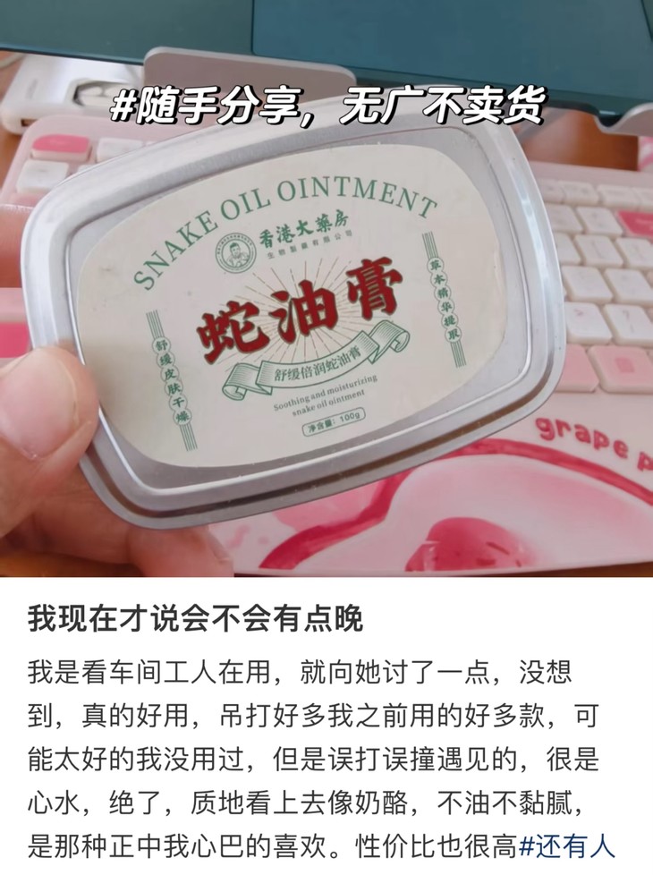 一到秋冬,手手脚脚是真的容易裂开,我也是上了蛮多,雪玉的足跟特护霜和尿素霜,金蛇油膏和手油,还有北方手霜、鳄鱼膏、手膜足膜等等等等,最近试到香港大药房的蛇油膏,也很值得用用,滋润力拉满,关键价格还格外亲民,全身用都不心疼,完全可以用来当手膜厚涂!