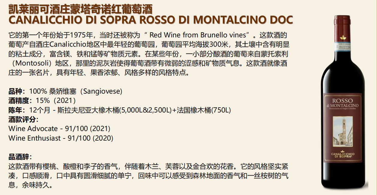 【高分易饮款】CANALICCHIO DI SOPRA ROSSO DI MONTALCINO DOC 2021 750ML 凯莱丽可酒庄蒙塔奇诺红葡萄酒