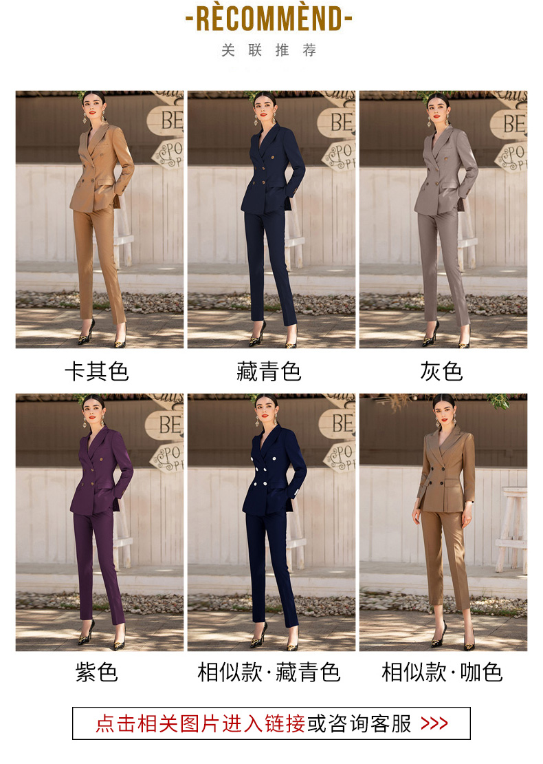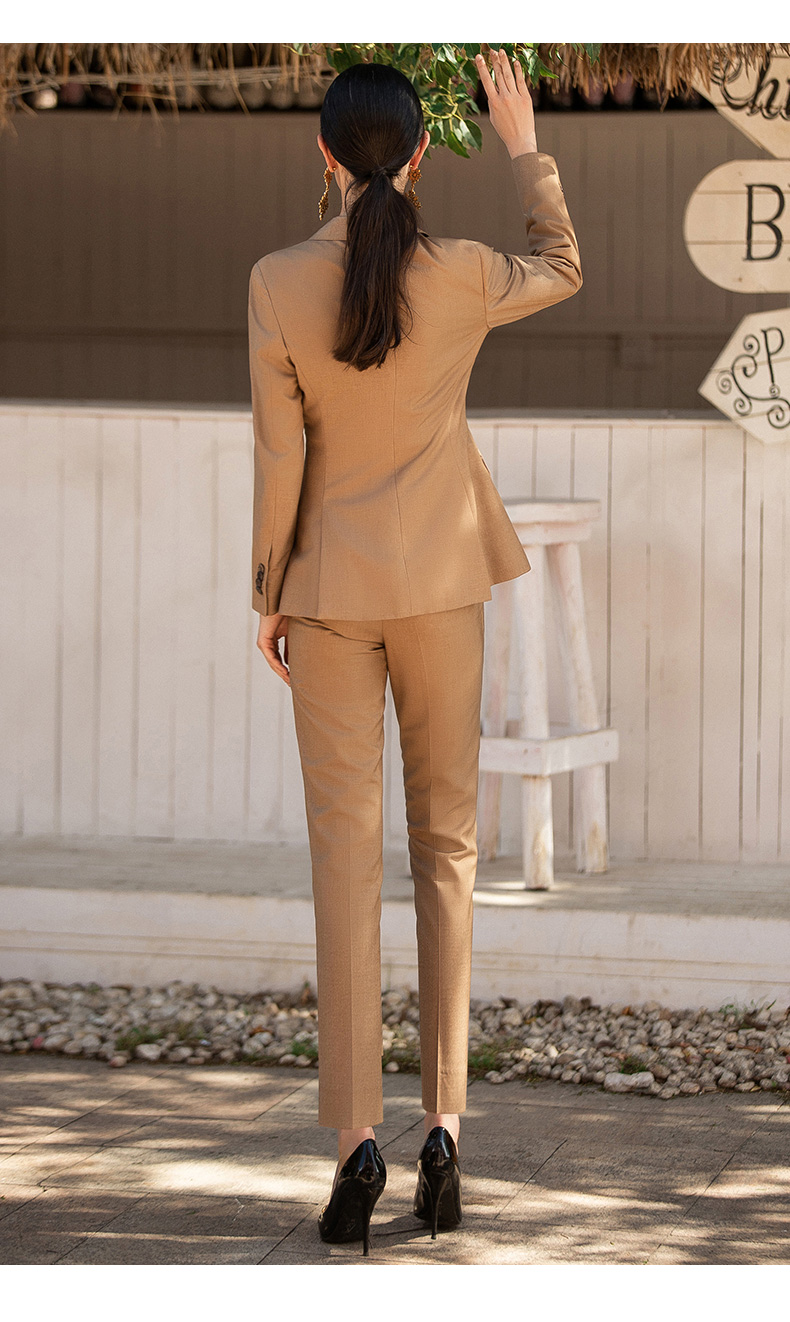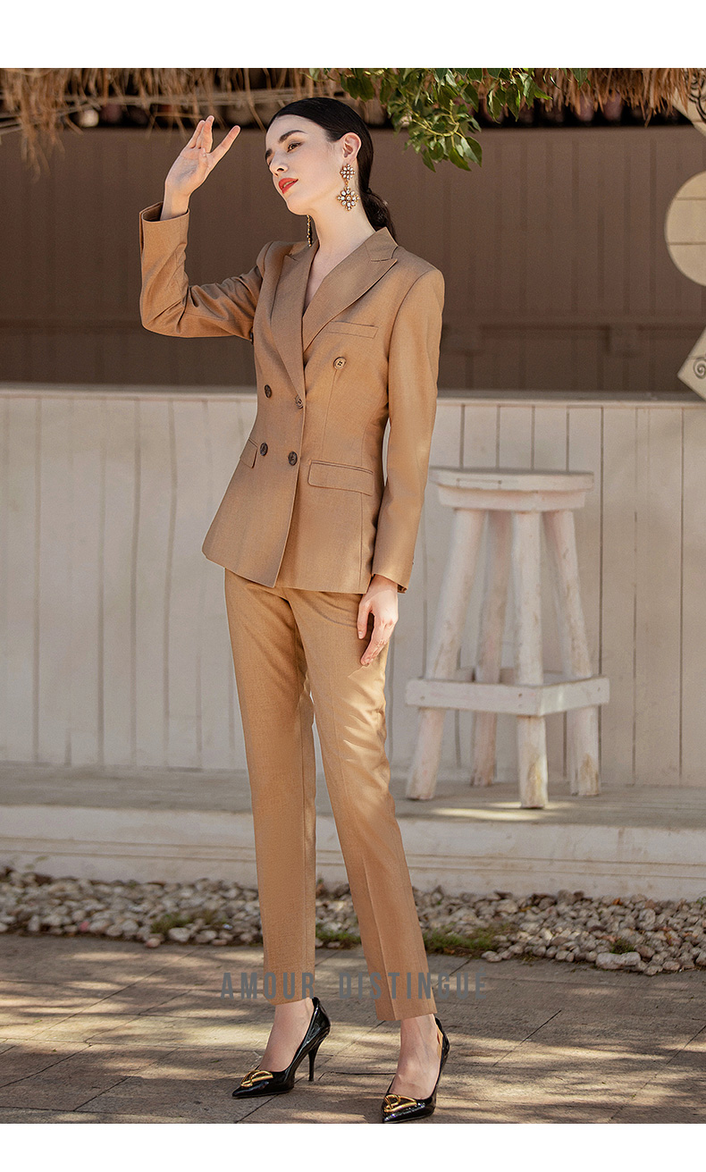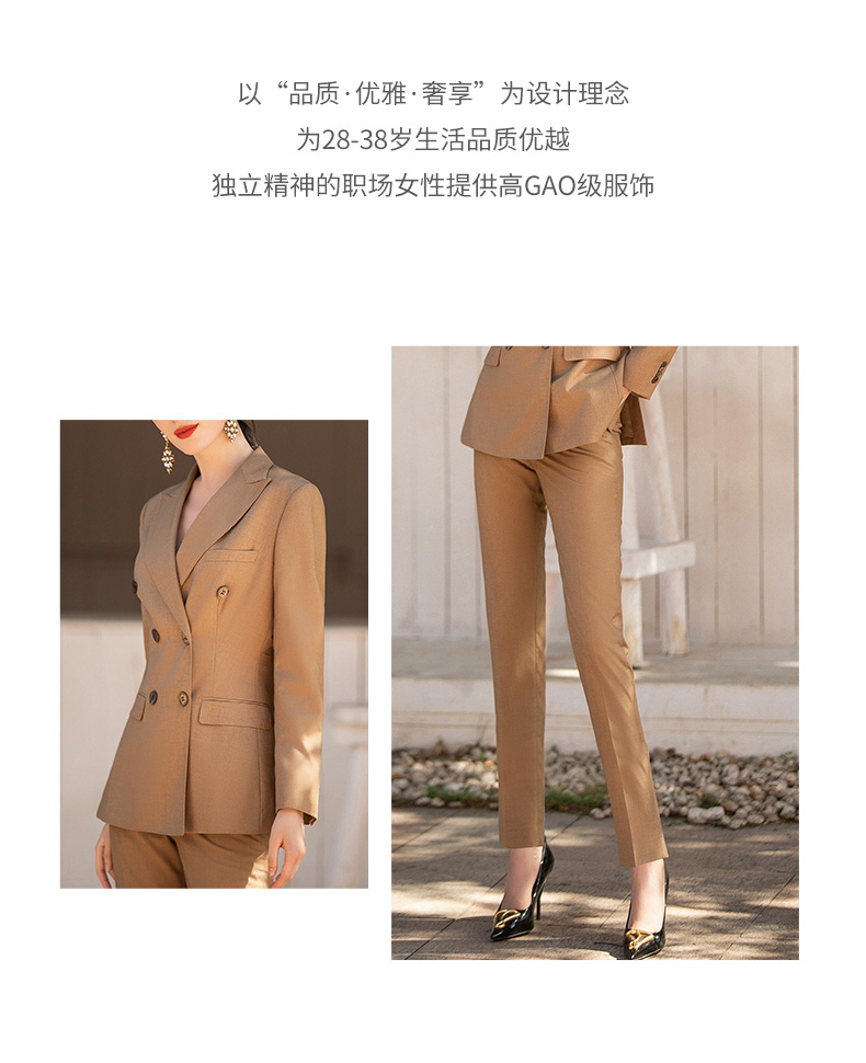 AD高端卡其色干练西装套装女春秋英伦风双排扣时尚职业装气质工装