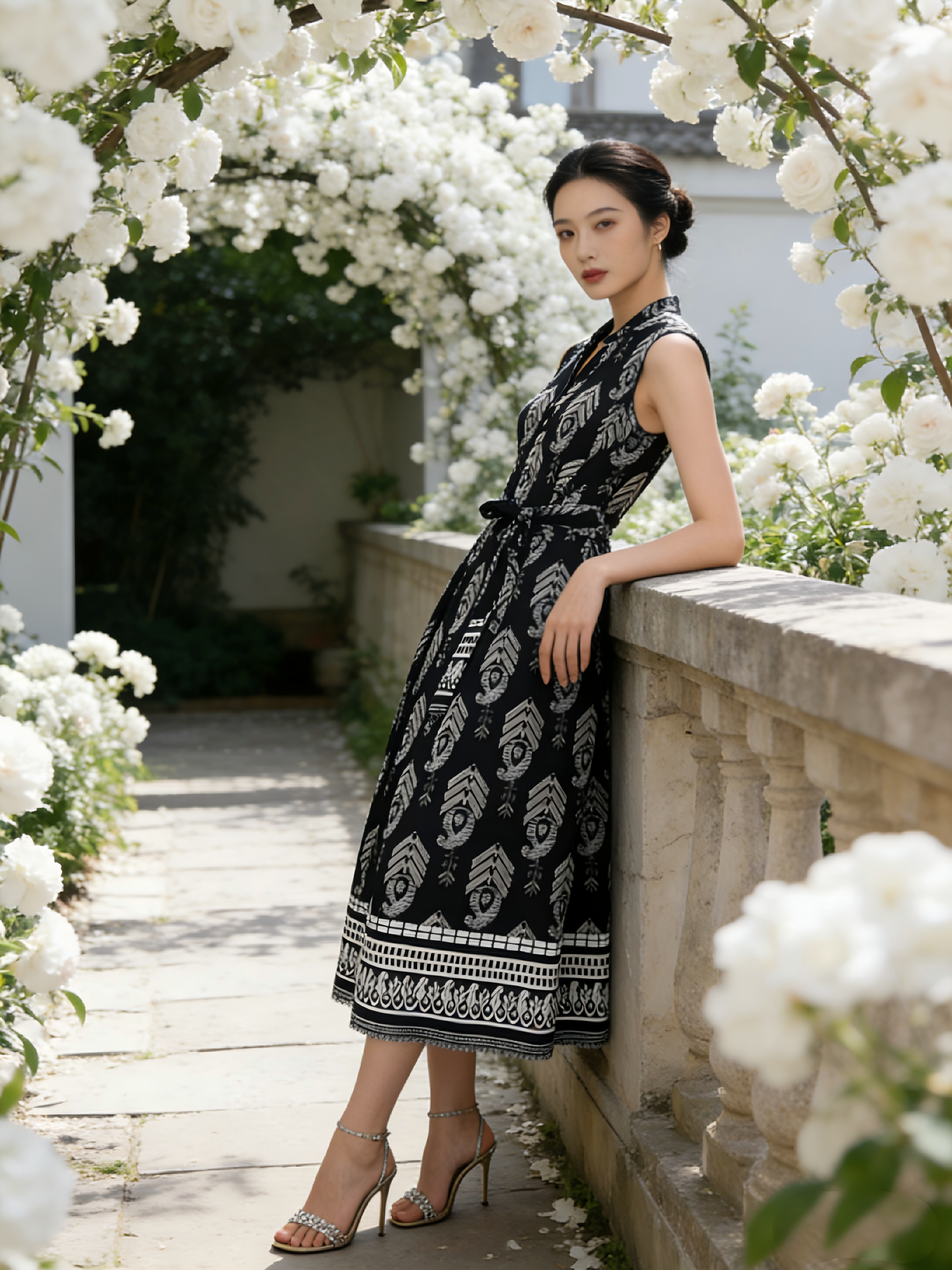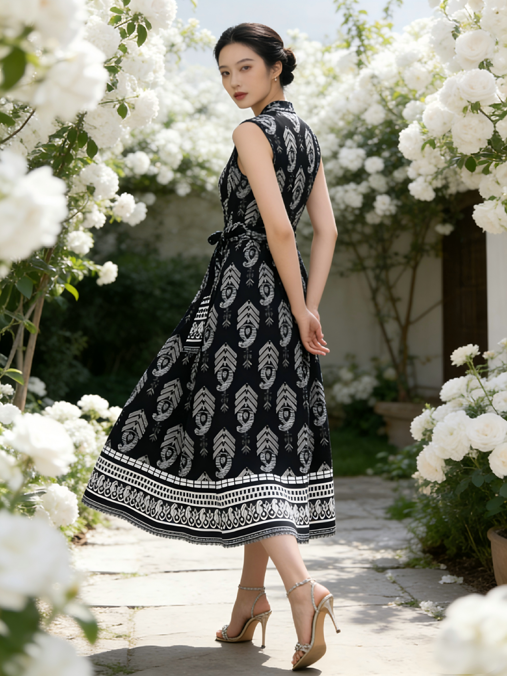 SC2S60_漆黑色_连衣裙_夏季_立领无袖V门襟系带收腰民_高级女装_BERNIEELEN 伯妮斯茵