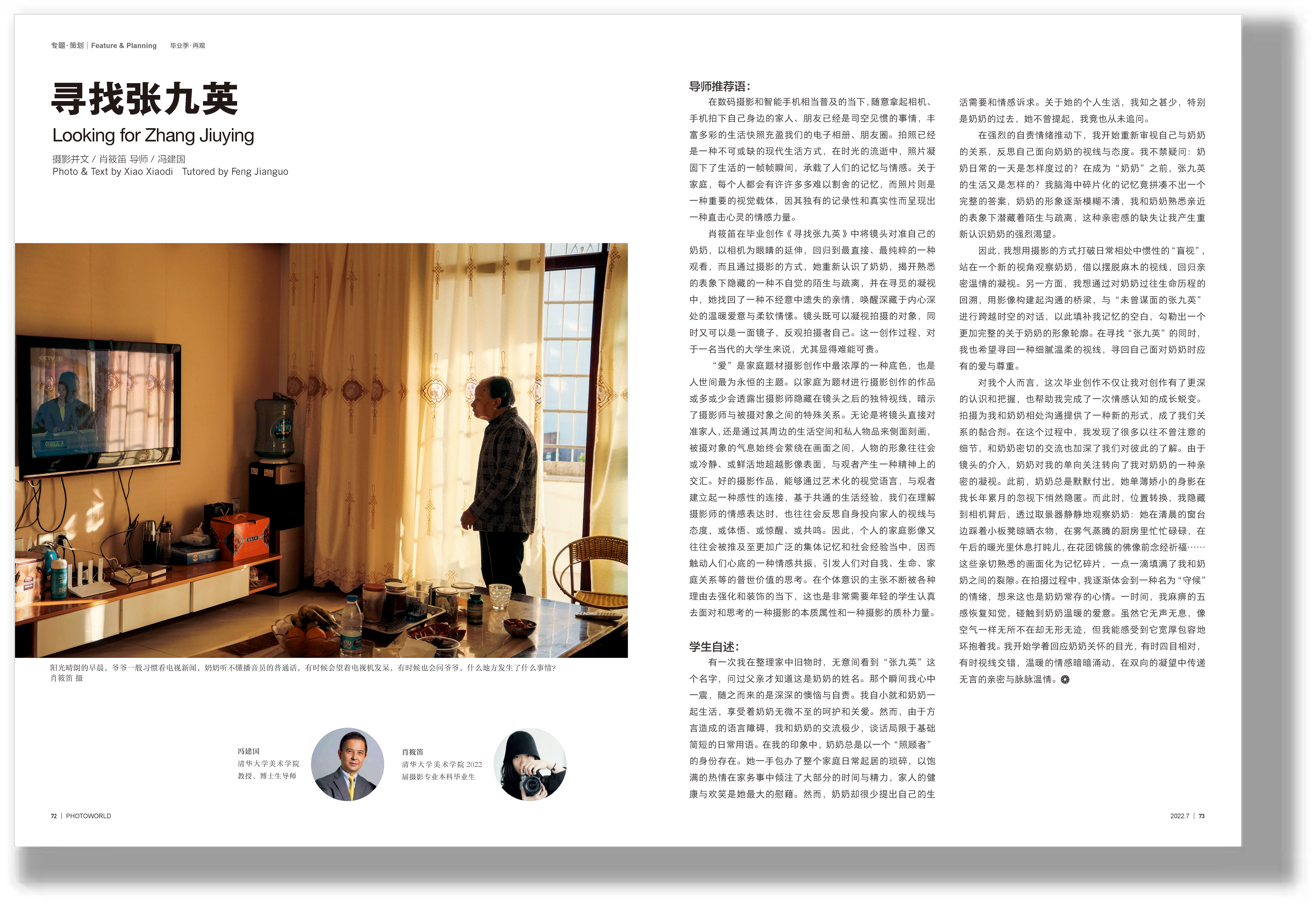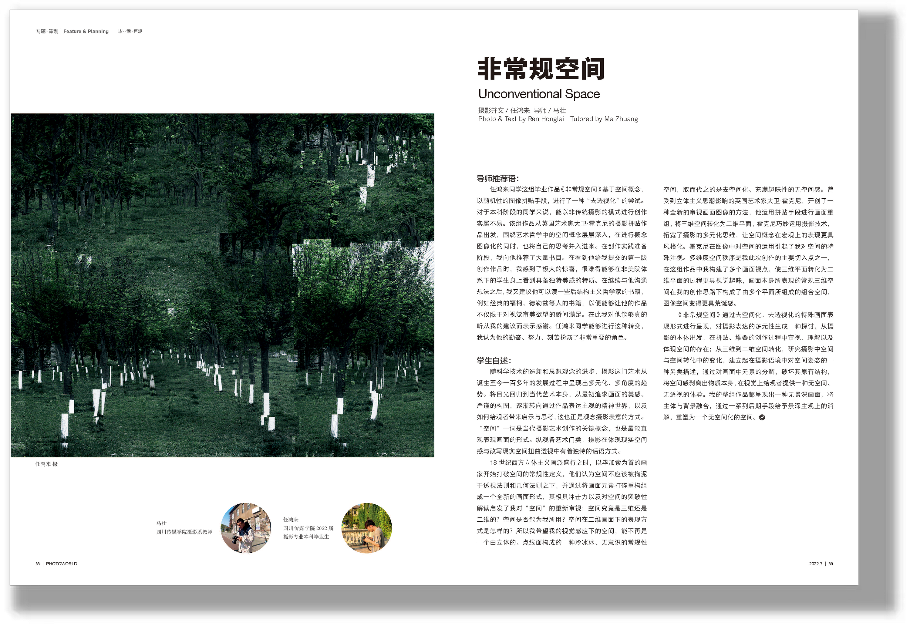 肖筱笛在《寻找张九英》中将镜头对准了自己的奶奶张九英,并通过摄影的方式揭开熟悉表象下不自觉的陌生与疏离,并在寻觅的凝视中找回在不经意间遗失的亲情;高晗驰的《小镇青年》以家乡小镇景观作为切入点,选取几位具有代表性的青年,呈现出东北部分地区的小镇现状和青年人的人生选择;任鸿来的《非常规空间》突破了传统,以随机性的图像拼贴手段,进行了“去透视化”尝试,在拼贴、堆叠过程中审视、理解并体现空间的存在;孙杨洋的《四季青 99+》把镜头留给了妈妈,坚持自然捕捉这种相对传统的纪实创作方式,在朝夕相处之中走进母亲的生活日常,弥补了因代际差异而产生的裂痕。