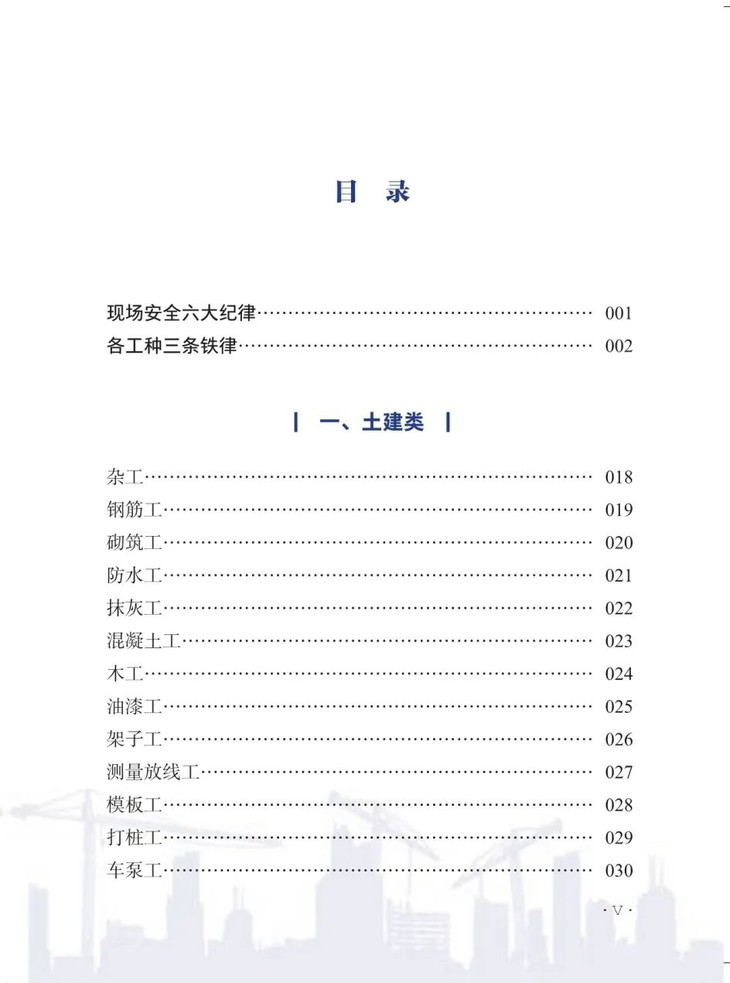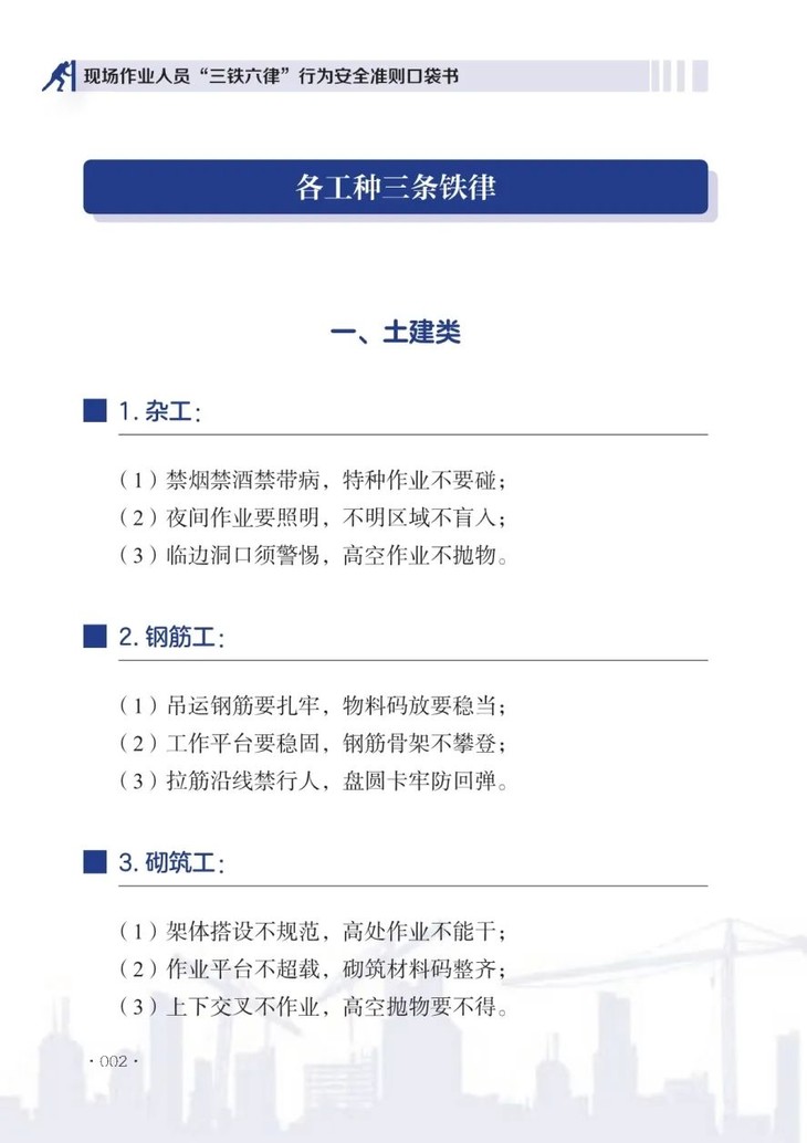 该书由中国建筑集团有限公司编写,中建集团领导对该书的出版非常重视,并由中建集团党组书记、董事长周乃翔担任编委会主任,党组副书记、总经理郑学选担任编委会副主任。该书采用生动的手绘漫画,配以朗朗上口的快板,将各工种均应执行的现场六大纪律,以及涵盖土建、安装、机械、装饰及制造五大类包括钢筋工、砌筑工、木工等49个工种的三条铁律(简称“三铁六律”),以通俗易懂的方式展现出来,作为规范一线作业人员的行为安全准则。