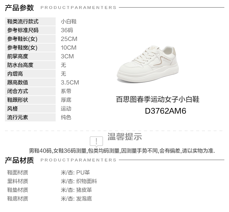 【云粉节】BF楼百思图2026春季新款厚底小白鞋舒适轻便运动女休闲鞋D3762AM6吊牌价669.现价399