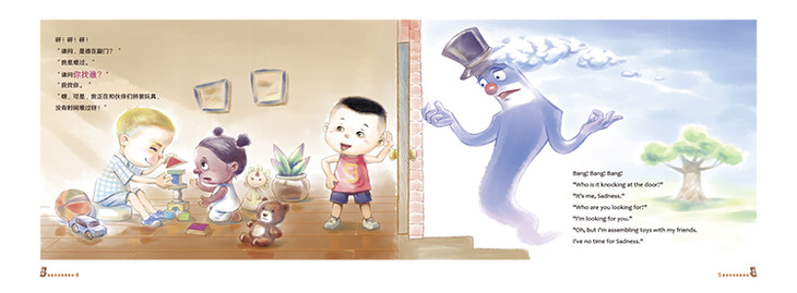 难过来敲门,见到三个因为各种原因正在难过的孩子,难过告诉他们难过时可以哭三分钟,但是不能哭个不停,否则眼泪就会变成灰色的河流带走孩子所有心爱的玩具。难过通过把眼泪变成礼物的方式让孩子知道,有了伤心事可以难过,但不可以时间太长,只要积极想办法,总可以让自己不难过,因为天空中总会有太阳,一切难过都将会过去。作者巧妙地将“难过”拟人化,通过敲门对话的方式让孩子明白“难过”实际上是一种选择,将“难过”拟人成神奇的魔术师,通过将“眼泪”变成礼物等情节,让孩子学会接受“难过”和调整“难过”情绪。