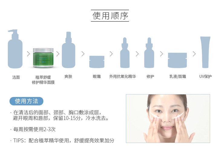 使用方法:取适量涂抹于面部、颈部和胸口,敷涂成层,避开眼周和唇部,保留10-15分钟后用冷水洗净(可以用后清洗,或免洗作为睡眠面膜使用)。每星期按需使用2-3次。