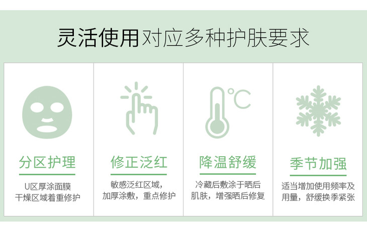 很多人在肌肤有问题时会T区油腻,U区干燥,用这款面膜时就可以着重涂抹U区,发姨妈痘时,又可以重点涂抹下巴那一块。夏天放在冰箱里,上脸超级舒服,冬天就可以少用一点,薄薄涂抹一层来做舍予缓。它能够降低肤感温度,补充流失水分,舍予缓泛红发烫等面部不适感,而且清透不油腻。