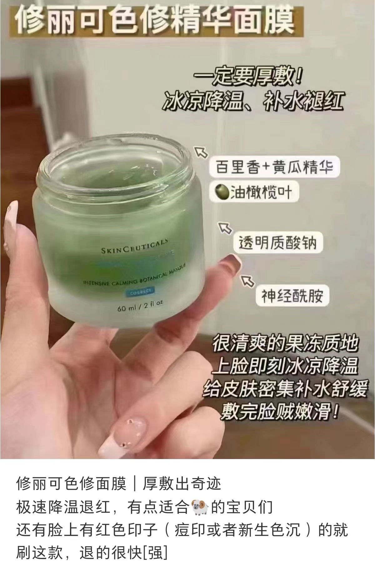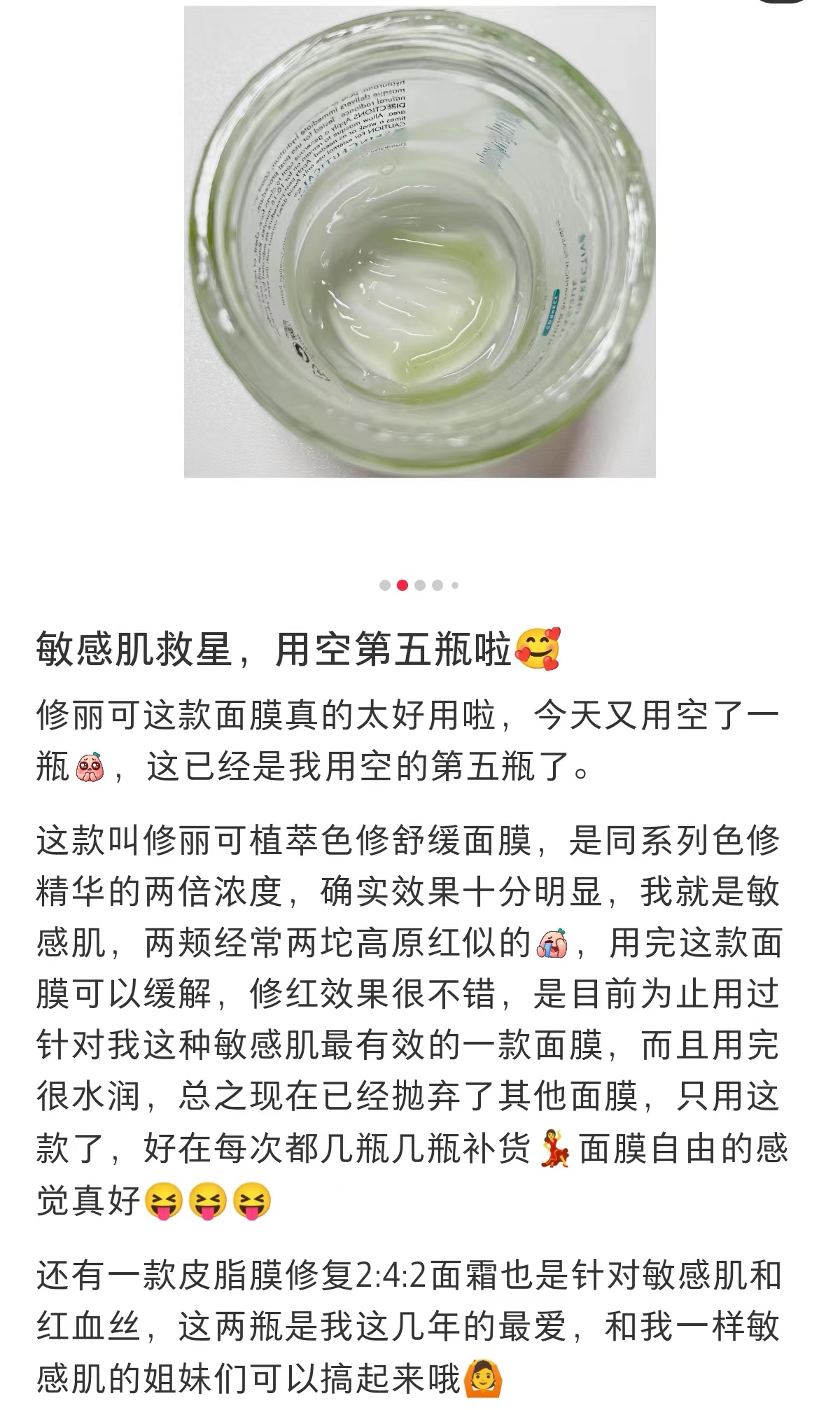 修丽可植萃面膜一直都挺火的,我曾经也用过好几罐,超级好用。无论皮肤过敏、晒后修fu还是舍予缓痘肌、紧急补水,它都行!