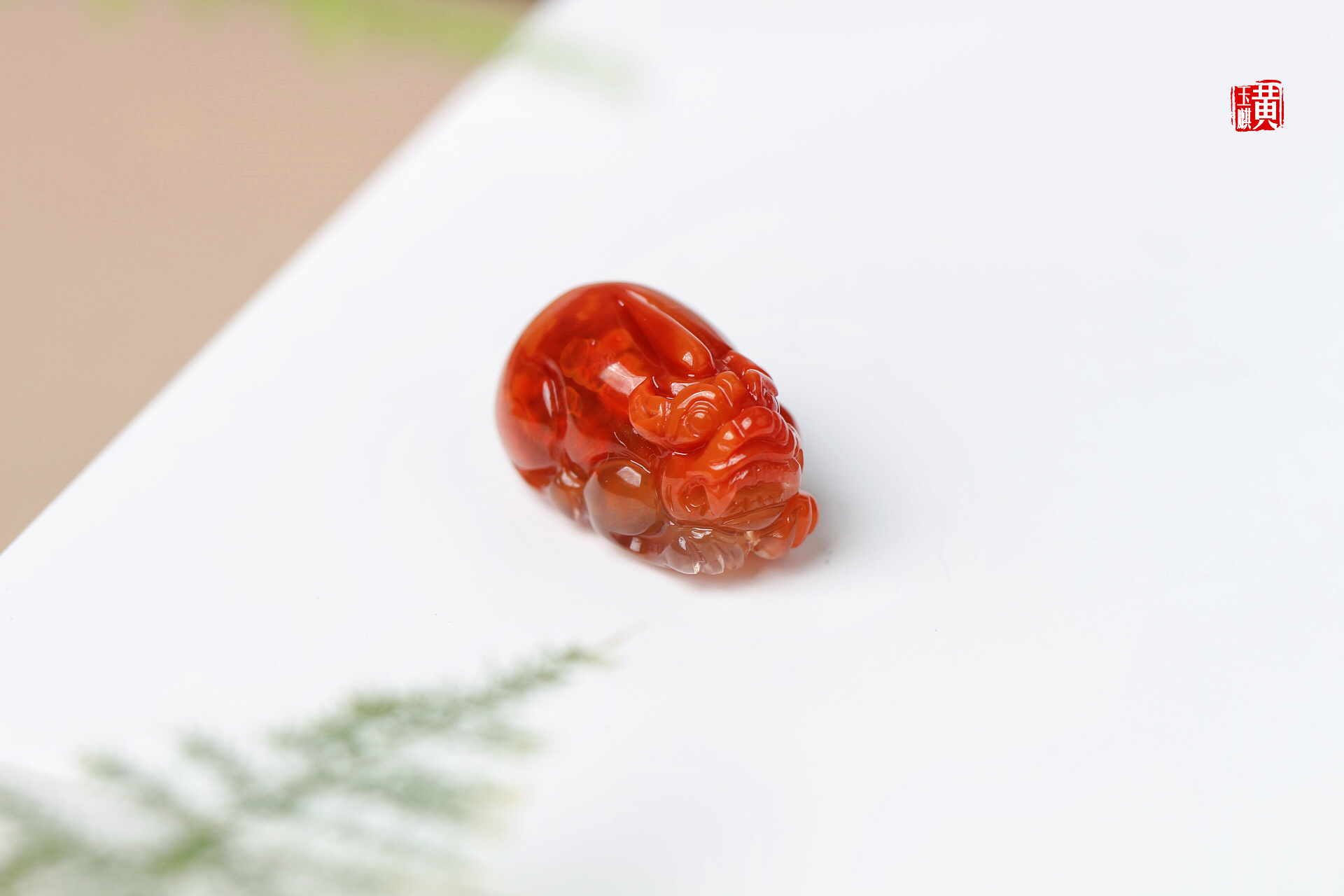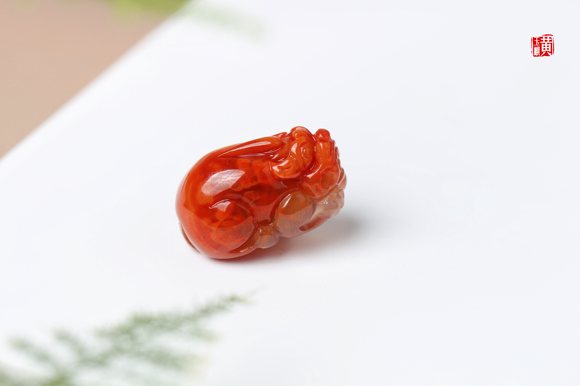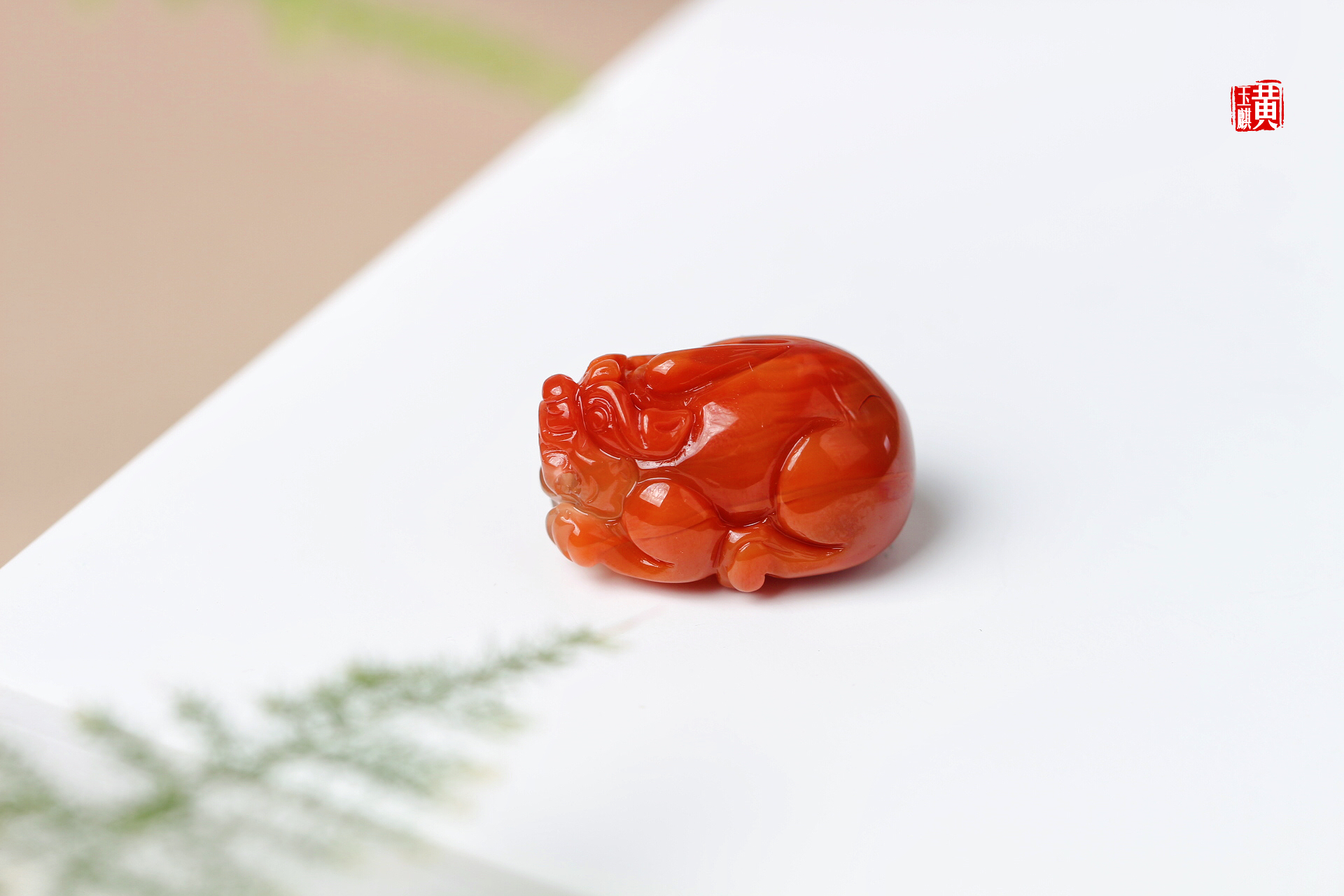 南红招财貔貅吊坠,色泽红润,鲜艳明亮,貔貅威武霸气,寓意招财纳福,鸿运当头,好运相伴。