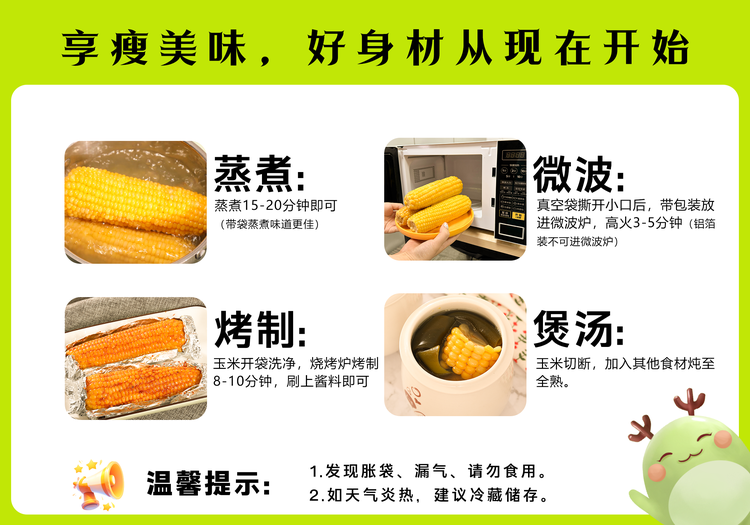 没开袋的玉米,常温避光存储,室温过高的话冷藏保存就可以哦!当玉米蒸煮后请尽快食用。上锅蒸煮15到20分钟口感最佳!