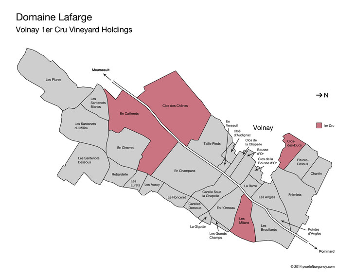 酒庄目前拥有11.6公顷葡萄园,包括四块Volnay一级园:Les Mitans、Clos des Chênes、Clos du Château des Ducs(酒庄的单一园) 、Les Caillerets。即使在二战之后施用化肥最为“流行”的一段时期内,Michel Lafarge也从未跟风,上世纪九十年代,酒庄成为勃艮第最早一批全面实施生物动力法进行种植和酿造的酒庄。