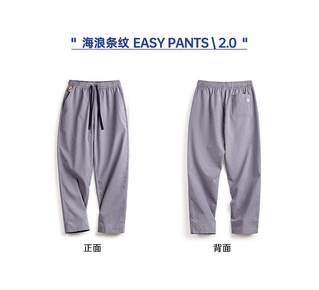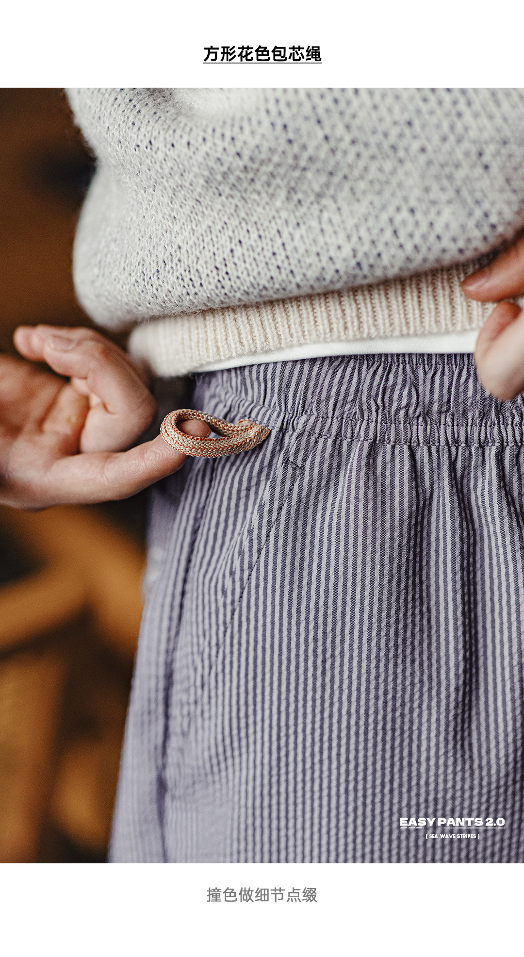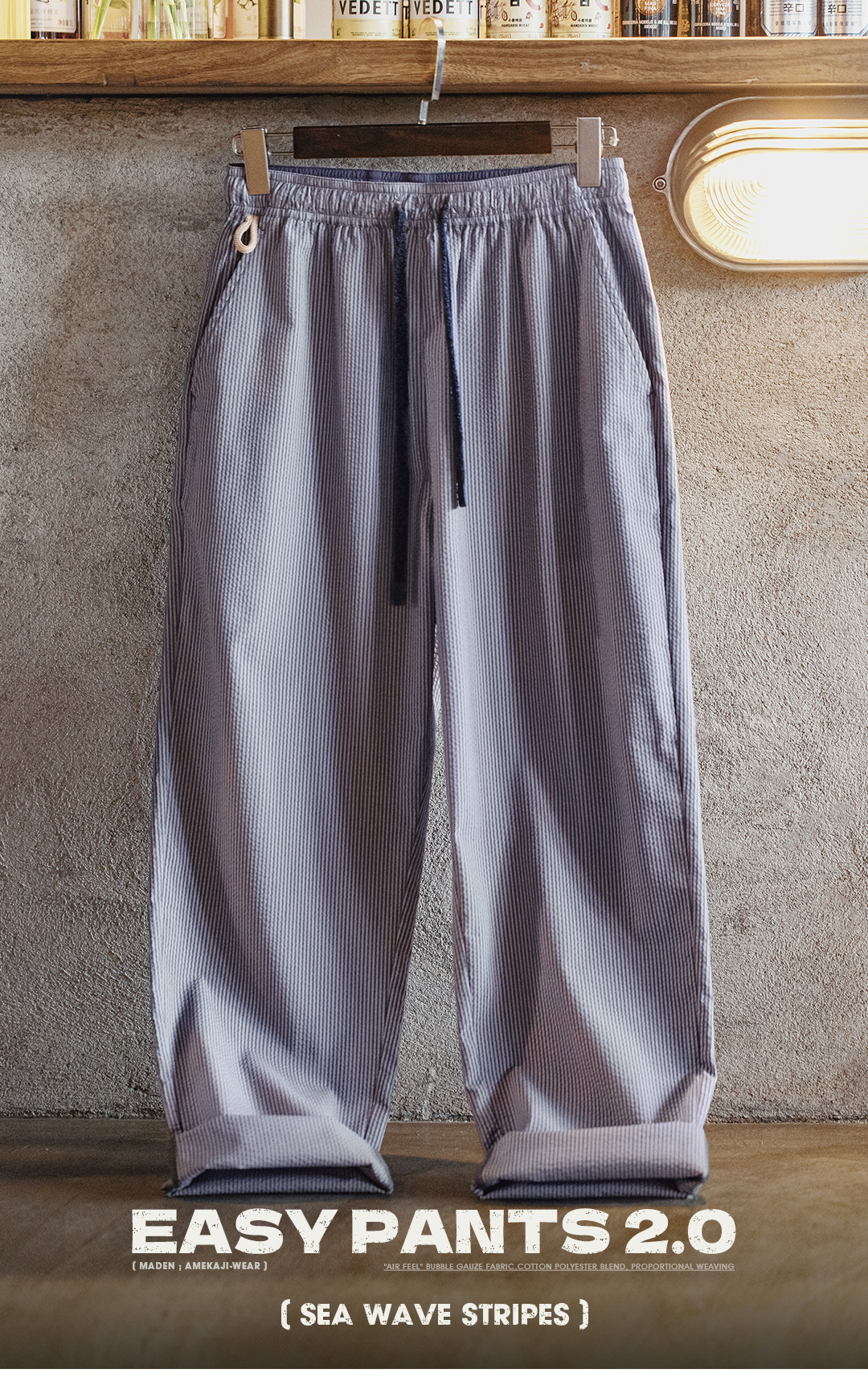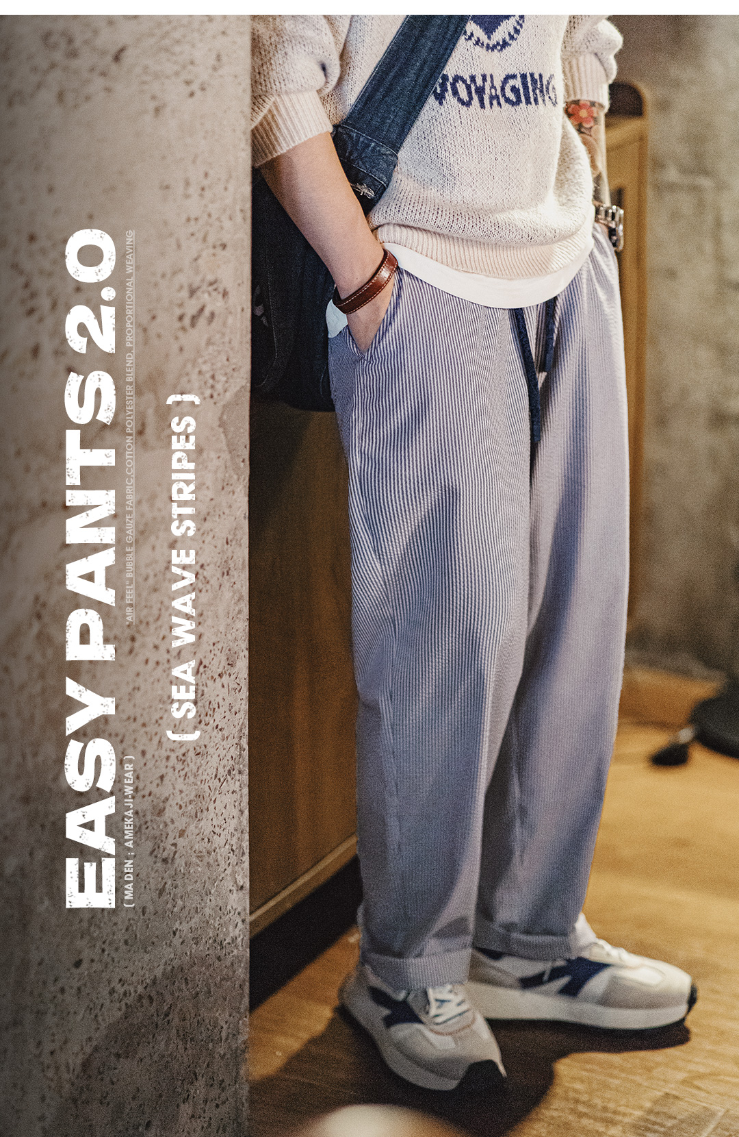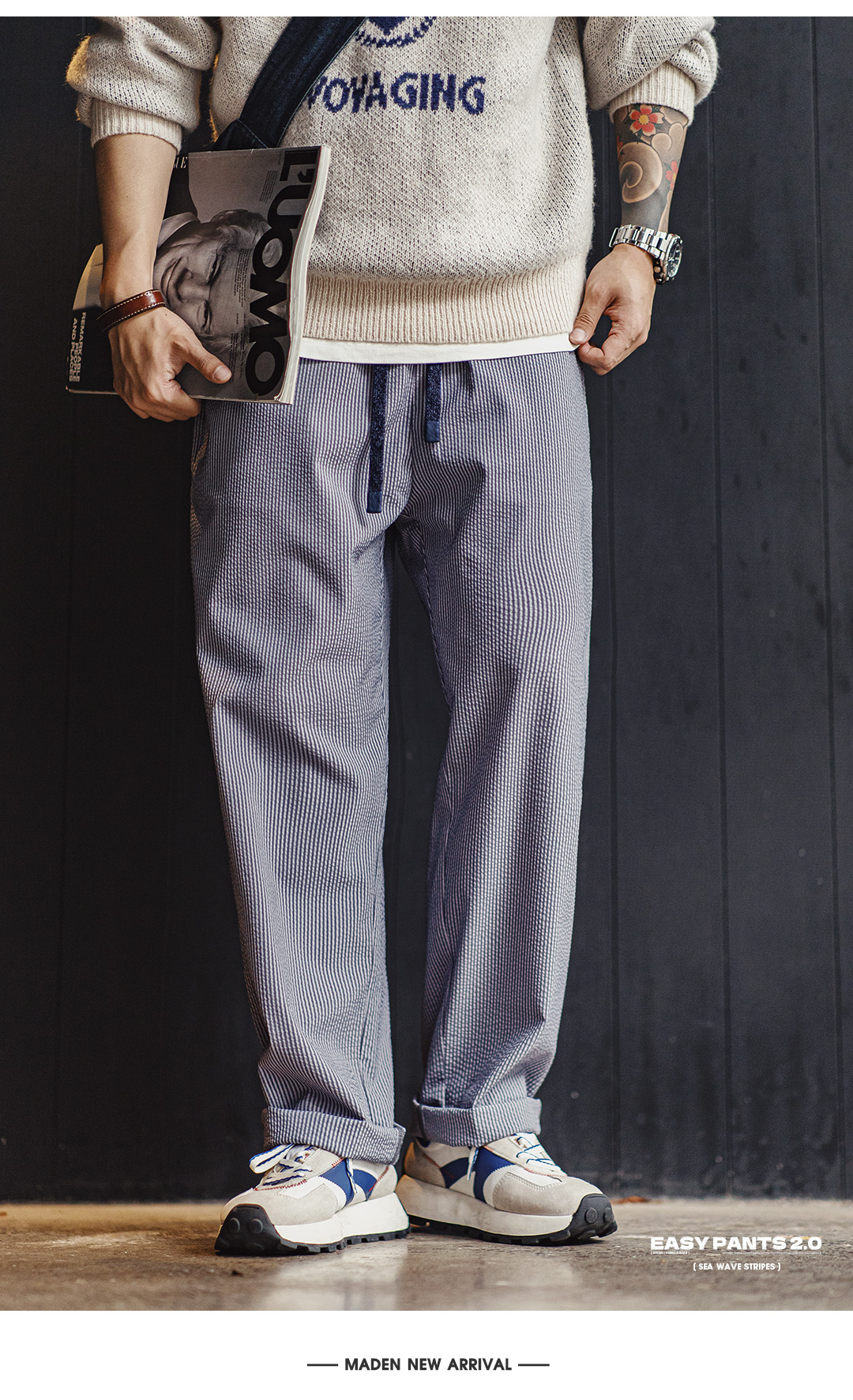马登工装 美式休闲海浪条纹直筒裤轻薄抗皱泡泡纱长裤抽绳运动裤男夏