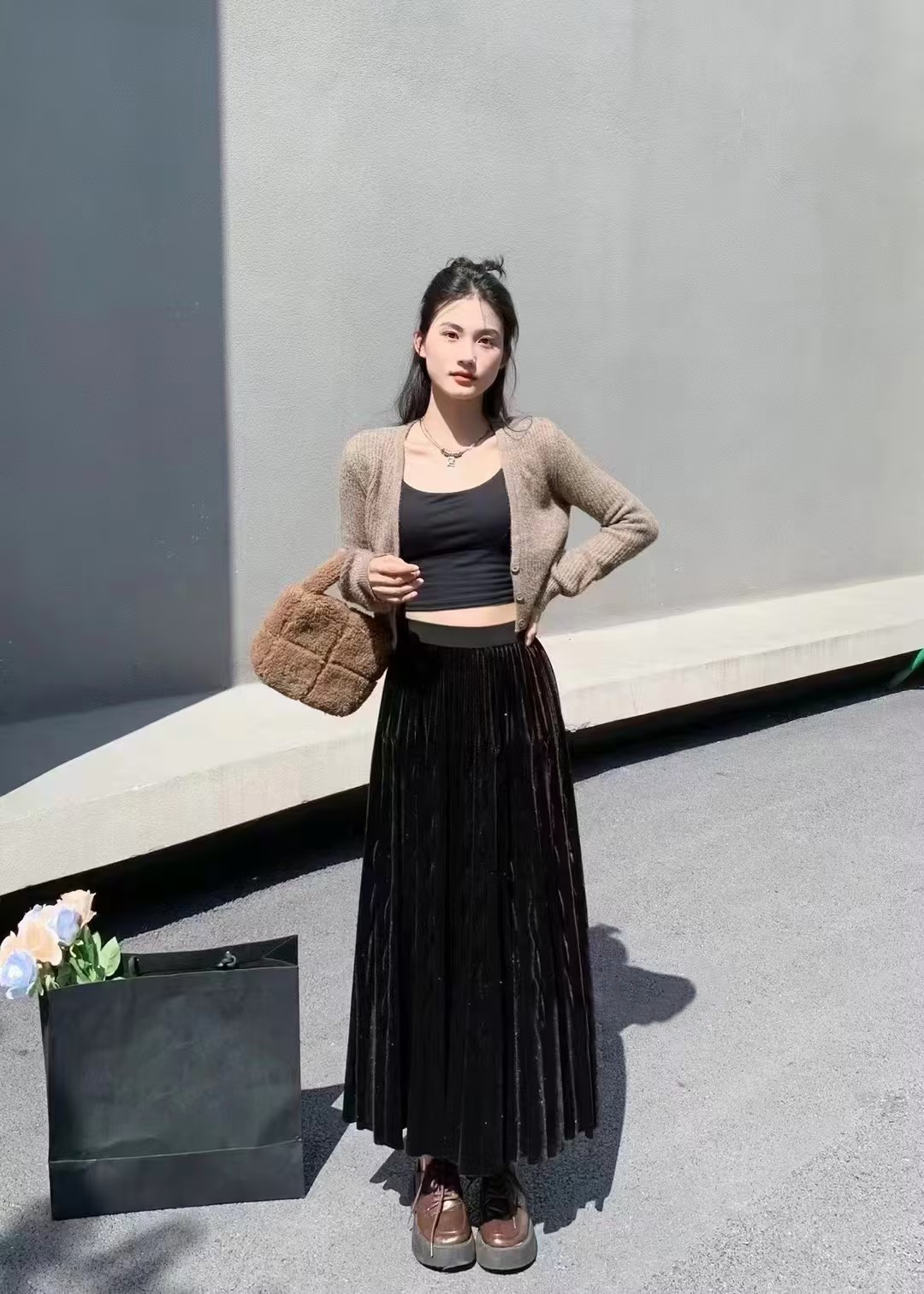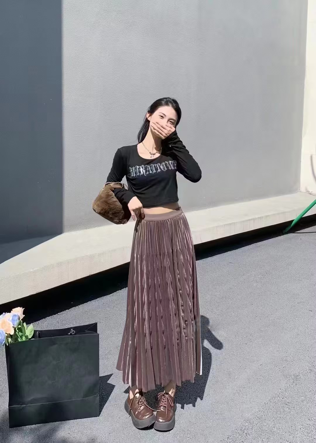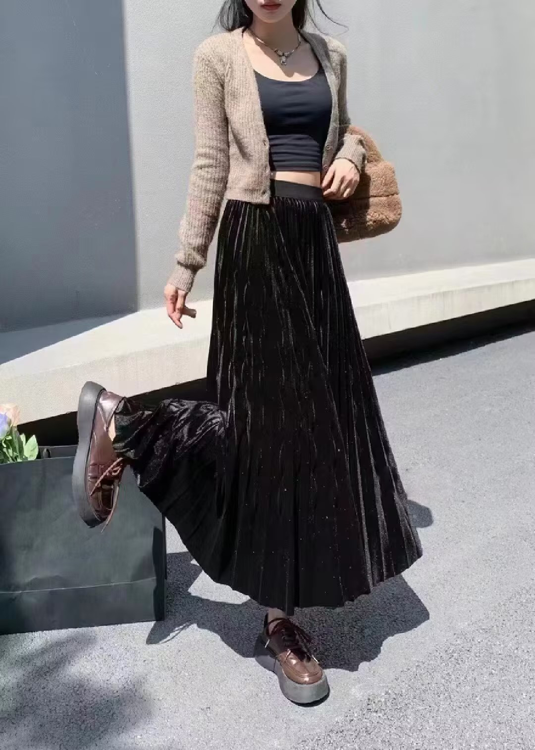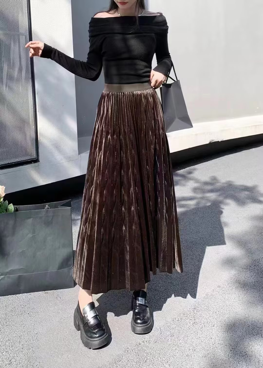 伯妮斯茵 | 轻奢名媛风 亮丝金丝绒百褶裙 高腰中长款大摆裙 秋冬气质显瘦裙 HJ3B60
