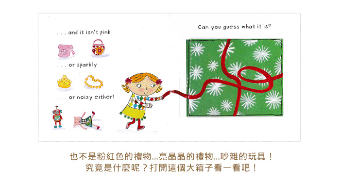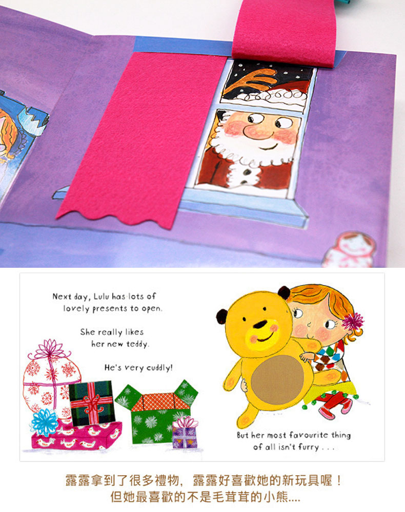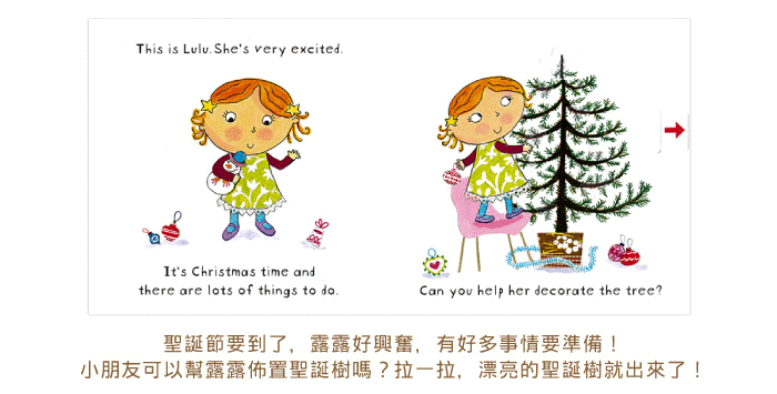 圆圆的脸蛋绑着可爱发夹的小小女孩Lulu,这次也要和小朋友们一起过圣诞节啰!快来帮她一起布置吧~要不要和Lulu一起来布置圣诞树呀?睡觉前,要不要偷偷的期待下礼物呢?Lulu第二天起来,有泰迪熊的礼物,收到礼物的Lulu太开心了。但是,这并不是她喜欢的,你知道她喜欢的是什么吗?