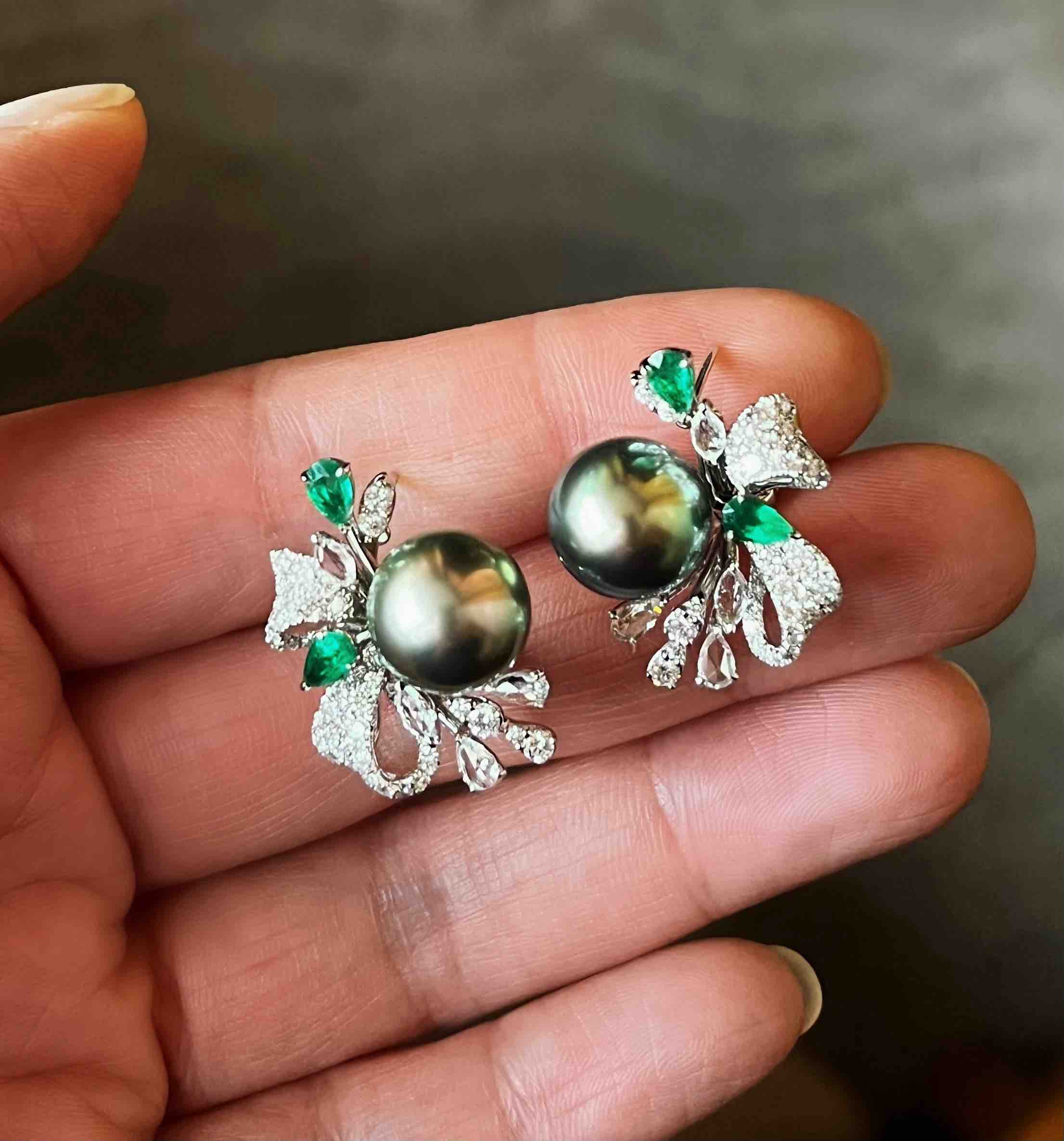 作品名称:18K镶钻石、祖母绿和大溪地珍珠耳钉