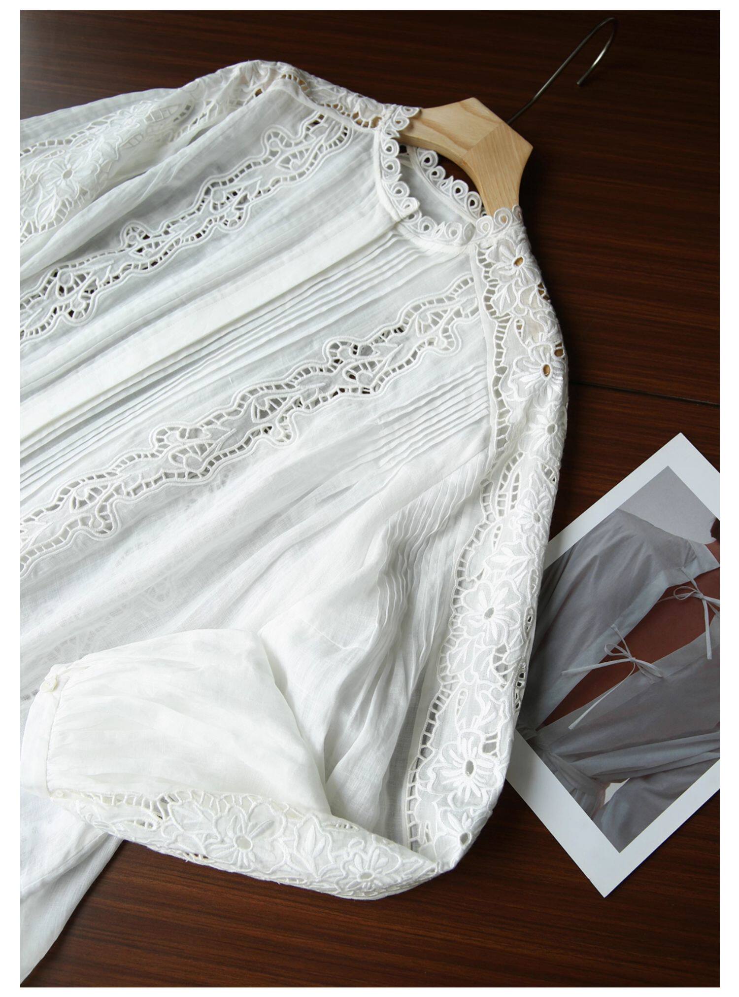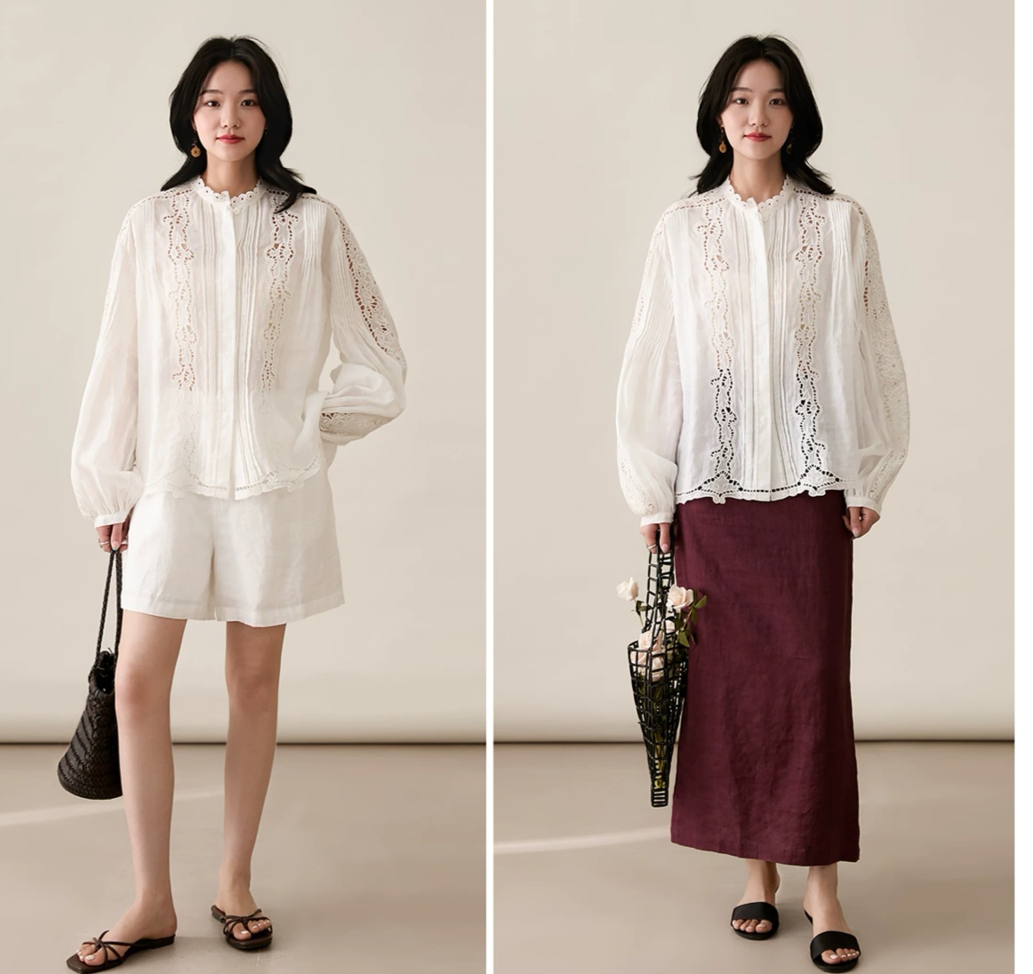 文艺巴黎,法式宫廷苎麻棉小衫,将"呼吸感"轻盈苎麻与繁复工艺融合在衣身雕刻出立体镂空浮雕的效果,重工均匀打条工艺,增加繁美层次和微肌理,细腻精致的巧工层层堆叠,成衣依旧轻巧如初。