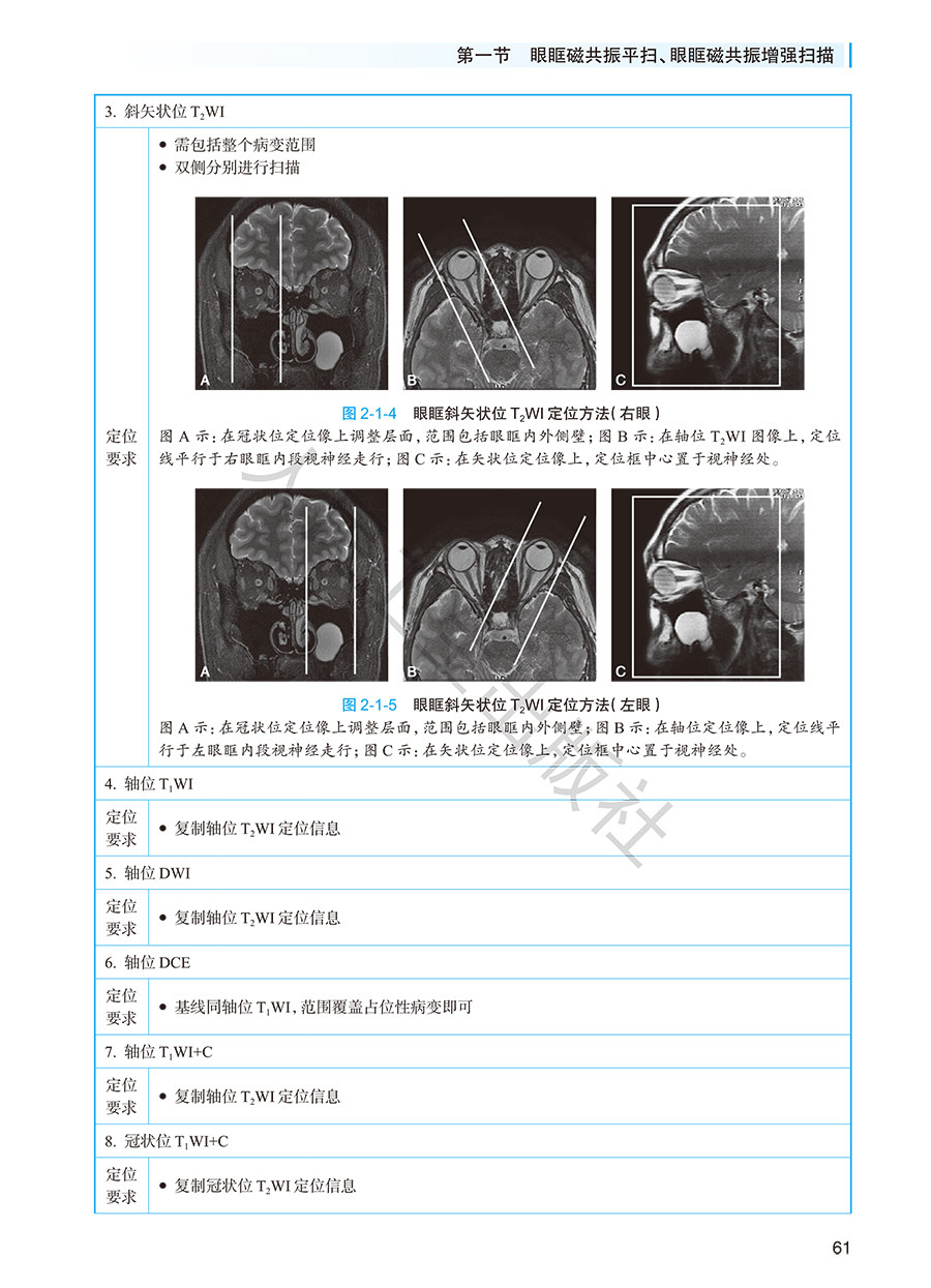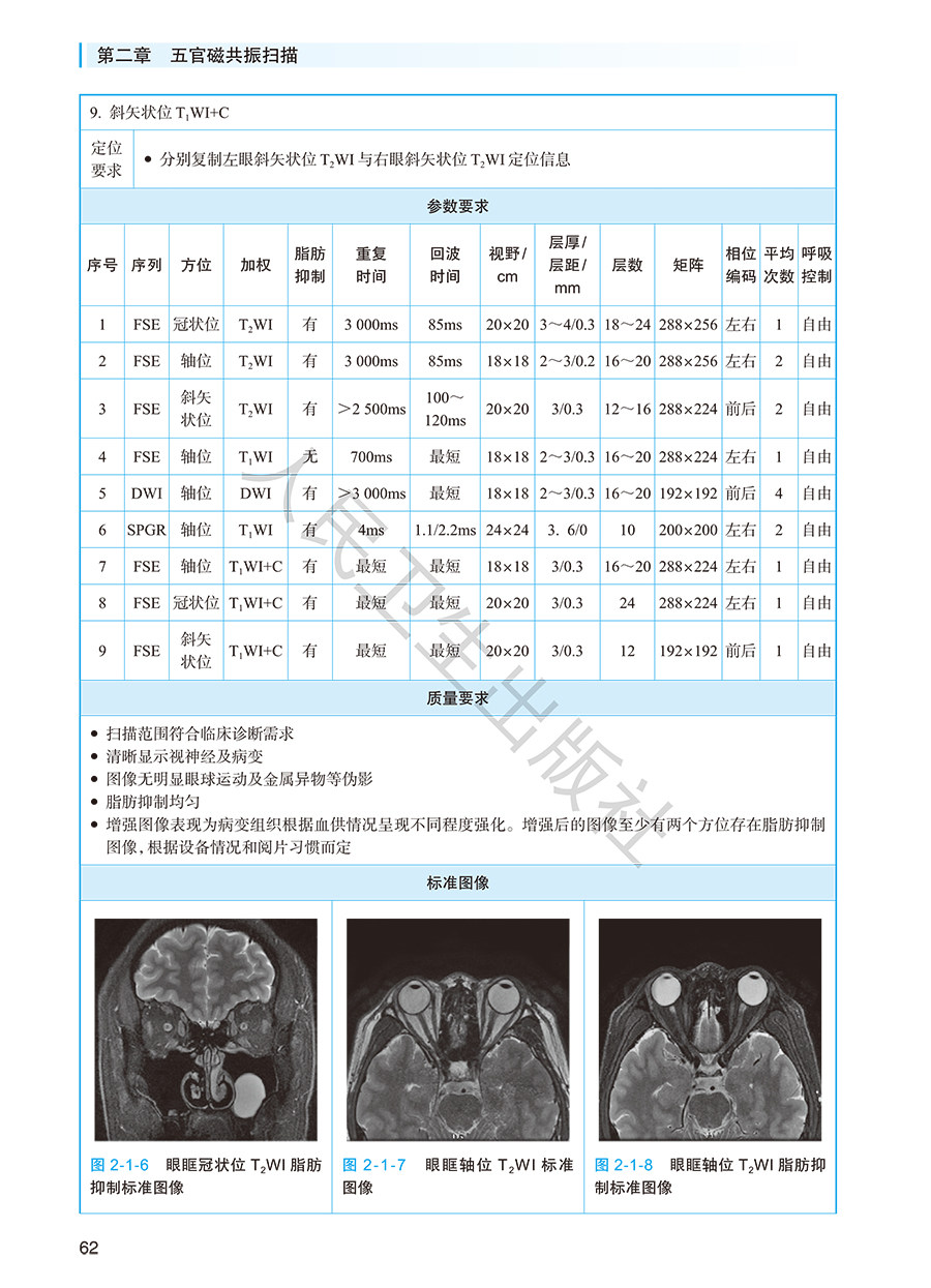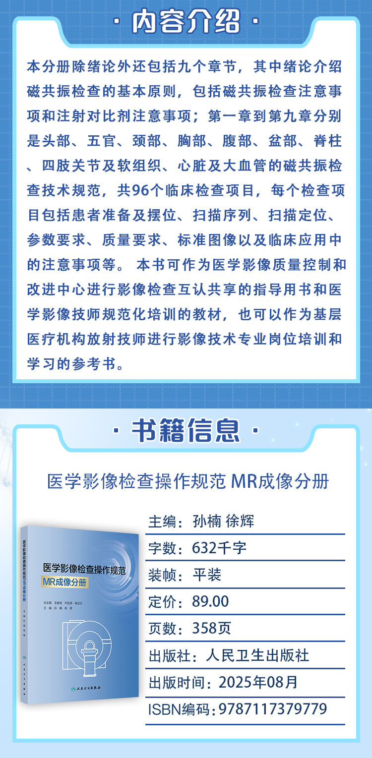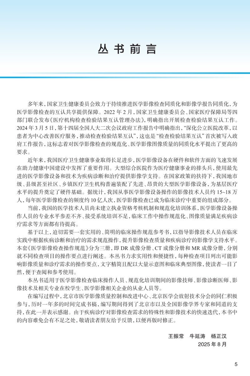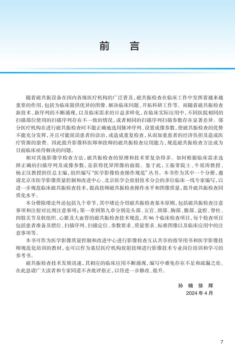本分册除绪论外还包括九个章节,其中绪论介绍磁共振检查的基本原则,包括磁共振检查注意事项和注射对比剂注意事项:**章到第九章分别是头部、五官、颈部、胸部、腹部、盆部、脊柱、四肢关节及软组织、心脏及大血管的磁共振检查技术规范,共96个临床检查项目,每个检查项目包括患者准备及摆位、扫描序列、扫描定位、参数要求、质量要求、标准图像以及临床应用中的注意事项等。本书可作为医学影像质量控制和改进中心进行影像检查互认共享的指导用书和医学影像技师规范化培训的教材,也可以作为基层医疗机构放射技师进行影像技术专业岗位培训和学习的参考书。