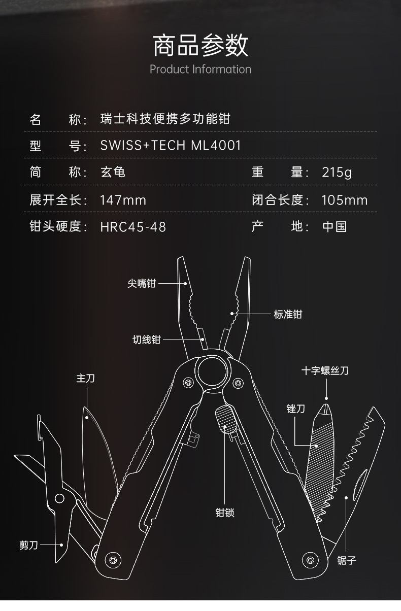 瑞士科技 SWISS+TECH 玄龟9合1伸缩碳纤维手柄工具钳-分销