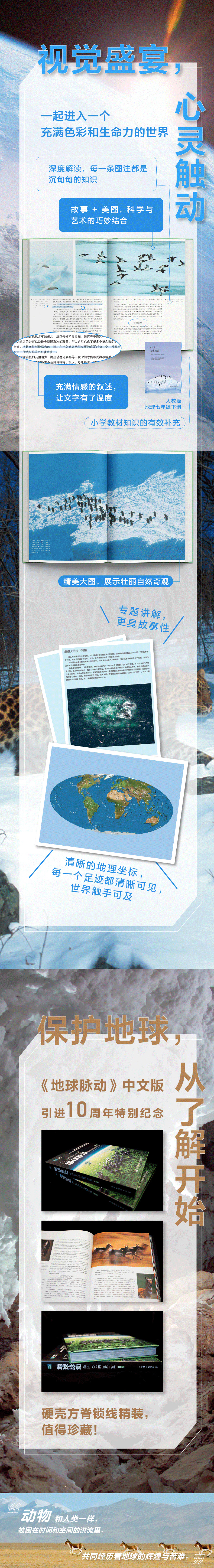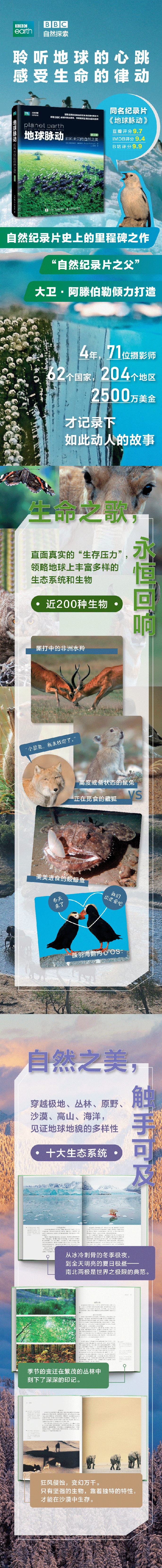 我们生活的这个星球从未被我们真正地欣赏过,人们尚未充分领略它的美好。BBC历时4年拍摄的鸿篇巨制——纪录片《地球脉动》(Planet Earth),通过开创性的拍摄技术,用镜头记录下了地球上那些美妙*极又令人惊叹的神奇画面。本书是纪录片《地球脉动》的同名图书,也是对这个具有划时代意义的自然历史类影像项目的永恒记录。本书对我们的地球进行了详细的描绘,展示了400多幅从纪录片中精选出的画面,这些画面中既有各类自然奇景,也有不同生态环境中的野生动物,同时还展现了部分人类从未记录过或拍摄过的动物行为。 请做好准备,让我们随着*故事感的画面,开始一段特别的世界自然栖息地之旅。