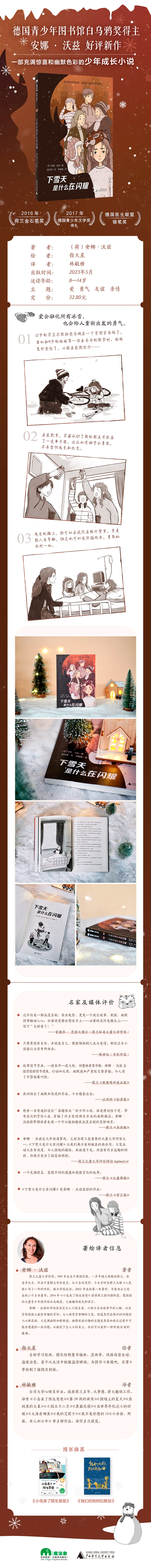 这是一部优质的成长小说,已有德语和荷兰语等版本出版。我社之前出版过同作者的作品《小岛来了陌生爸爸》,作品反响不俗,获得了读者和市场的认可。生动有趣的文字和真实深刻的成长体验并存,这样的作品深受家长认可和读者喜爱。故事中精彩的对话、出色的心理和细节描写,成功刻画了敏感的少年形象,真实可感地呈现出孩子从童年走向青少年阶段的历程。在故事背后,还探讨了家庭、友谊、亲情、爱情等深刻话题。
