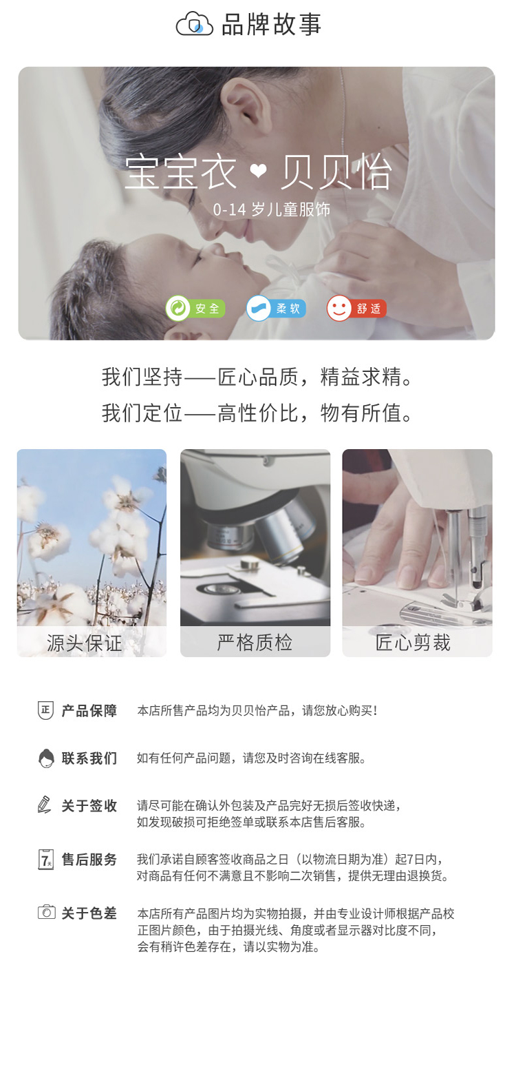 - 贝贝怡专注0-6岁婴幼儿服饰,坚持安全、柔软、舒适的产品理念,为千万中国家庭提供超高品质、安全可靠的婴幼儿服饰产品,妈妈放心,宝宝开心!