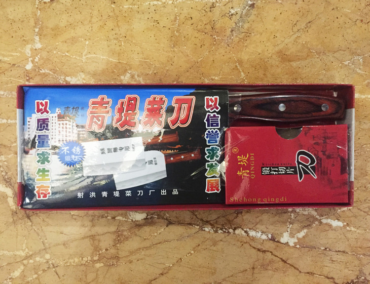 菜刀7.5两左右,手柄是红木的,刀面上都有“四川老字号青堤”等字样。