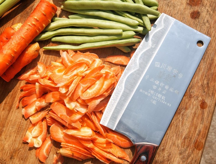 拿到这两把刀,小抱抱赶紧进厨房试用,不管是切肉还是切青菜,青堤菜刀比小编家的普通菜刀更锋利,切菜更省力,轻轻把刀锋放在菜上面一按,刀锋就钻进了菜里。