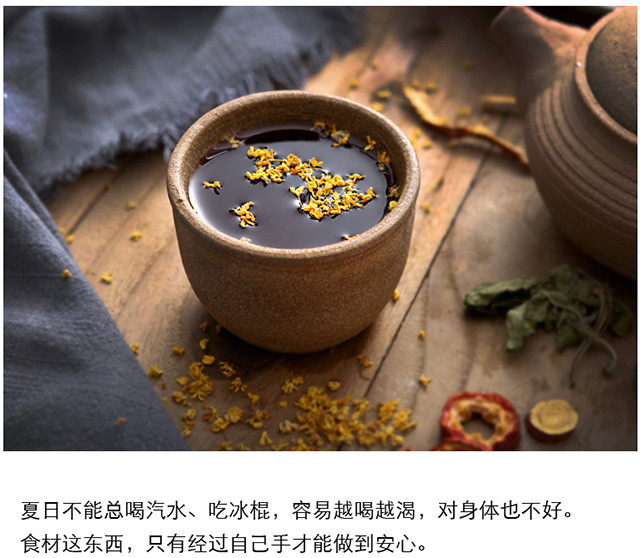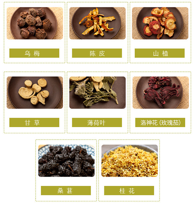 配料:乌梅、山楂、玫瑰茄、桂花、橘皮、薄荷叶、甘草、桑葚、冰糖