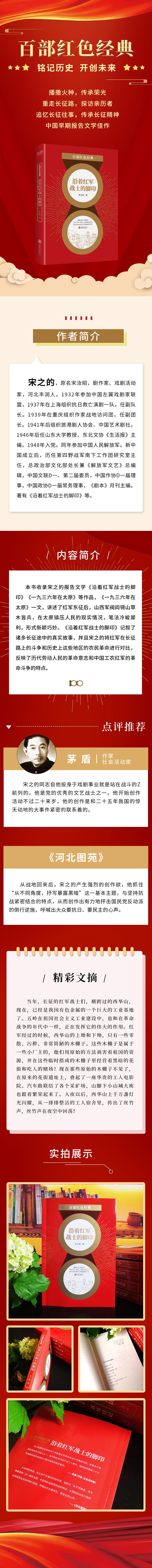 ★《沿着红军战士的脚印》是作者宋之重走万里长征路,历经井冈山、中央革命根据地、五岭、遵义、金沙江、大渡河等后,忠实记录所见所闻。★“长征精神”永不过时。红军长征是人类历史上的伟大壮举,意义深远。★“百部红色经典”系列丛书为发扬红色传统、传承红色基因专门设计,收入作品皆为名家名作,旨在重温红色经典,缅怀先烈,传承革命精神,弘扬爱国主义。