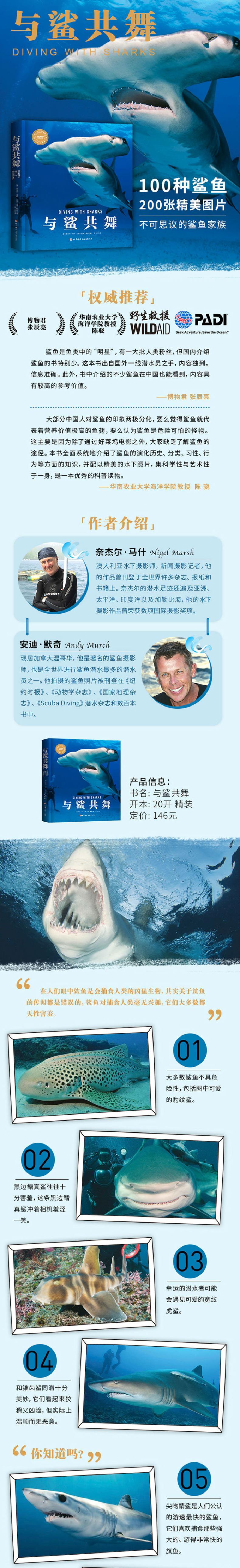 这是一本鲨鱼科普书,详细介绍了世界范围内的常见鲨鱼,还涵盖了许多稀有的、有趣的鲨鱼。主要讲了鲨鱼的生物学特性、鲨鱼面临的威胁、鲨鱼的相关研究与保护情况、投喂鲨鱼的利弊、热门观鲨潜点,以及如何更好地与这种优雅的生物互动。