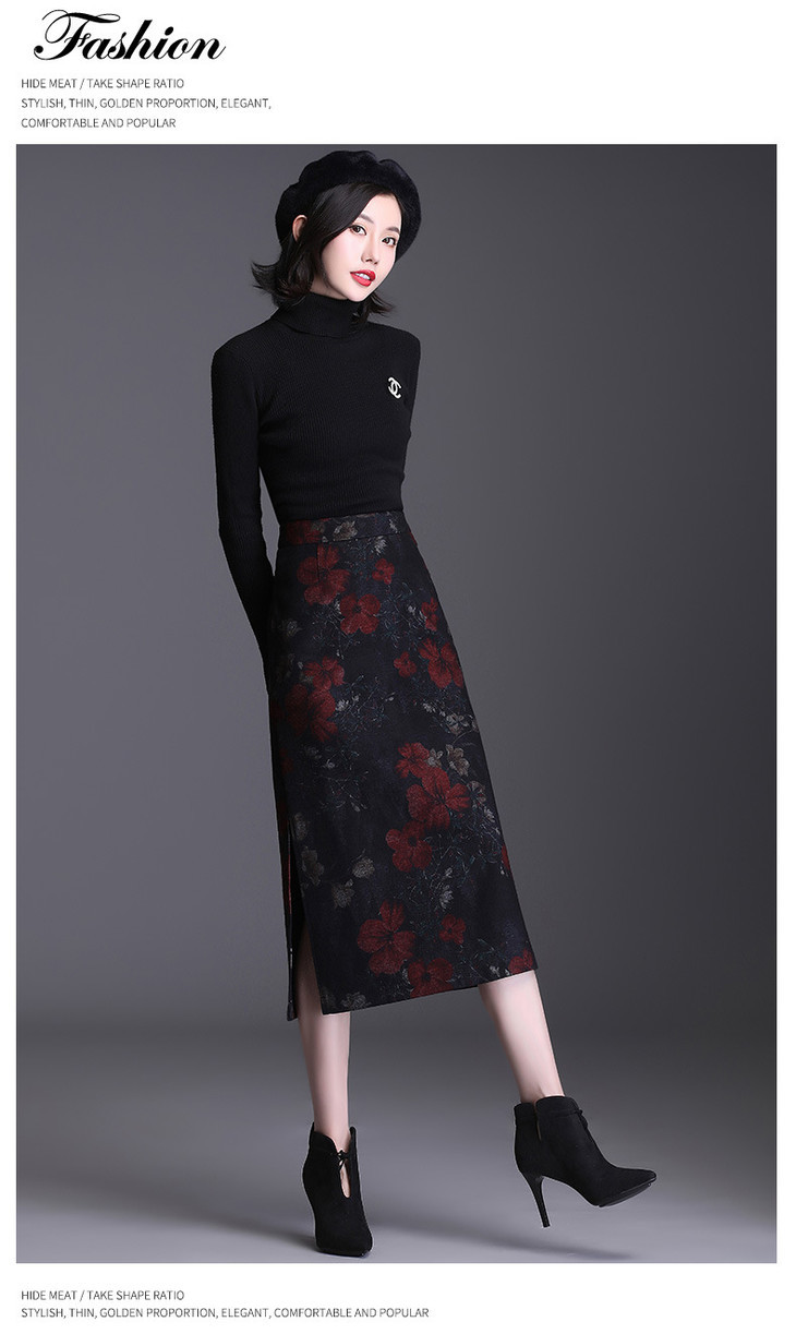 TY79110 新款复古秋冬印花毛呢修身民族风盘扣开叉一步半身裙