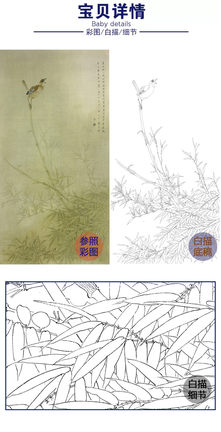 竖幅工笔花鸟白描底稿-周中耀-竹子《晨曲》-多种白描尺寸可选-ZT37