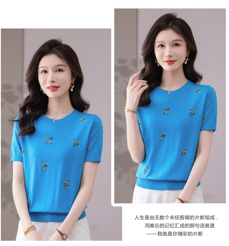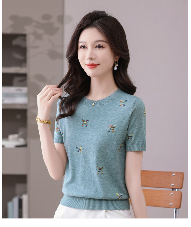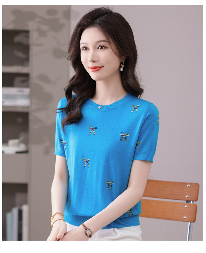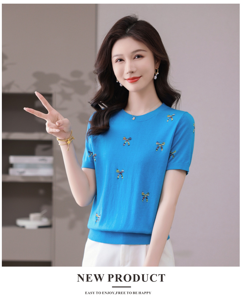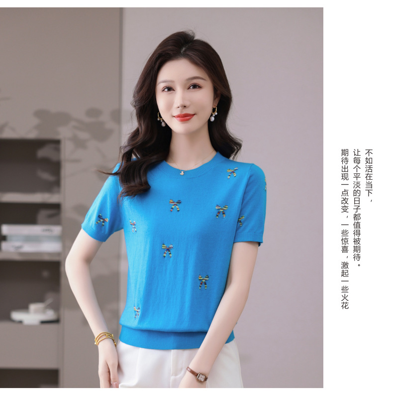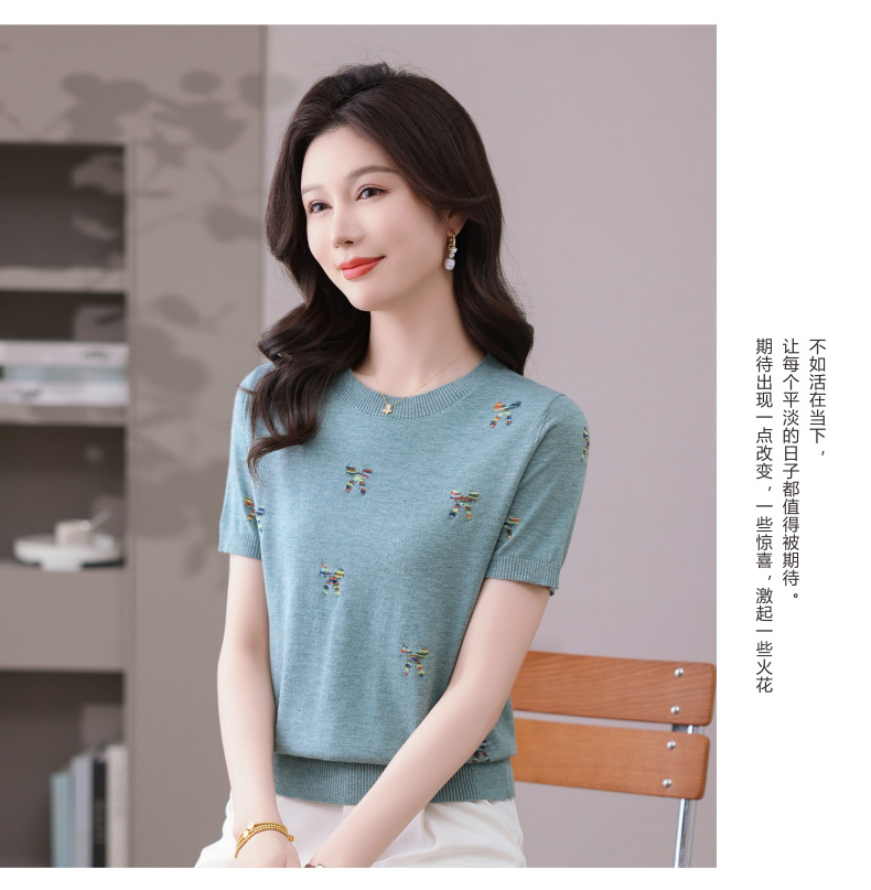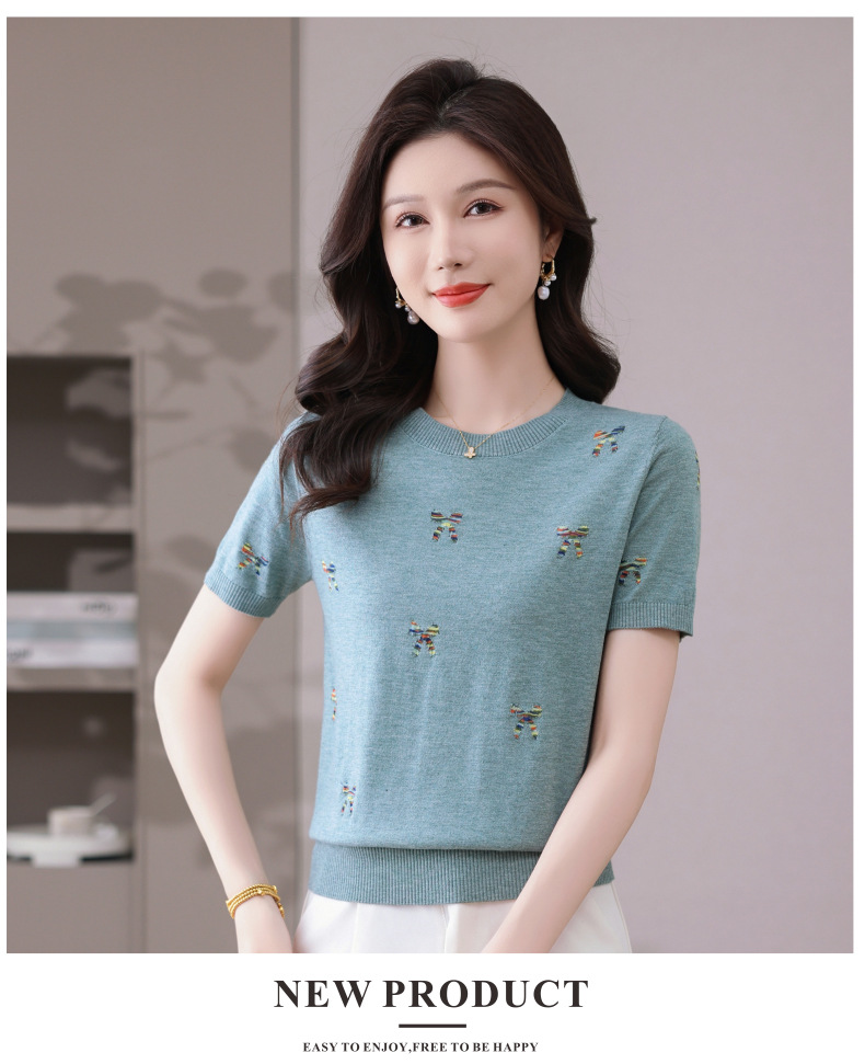 CC-101-356时尚刺绣圆领冰丝短袖t恤女2025新款夏季薄款针织衫显瘦短款上衣